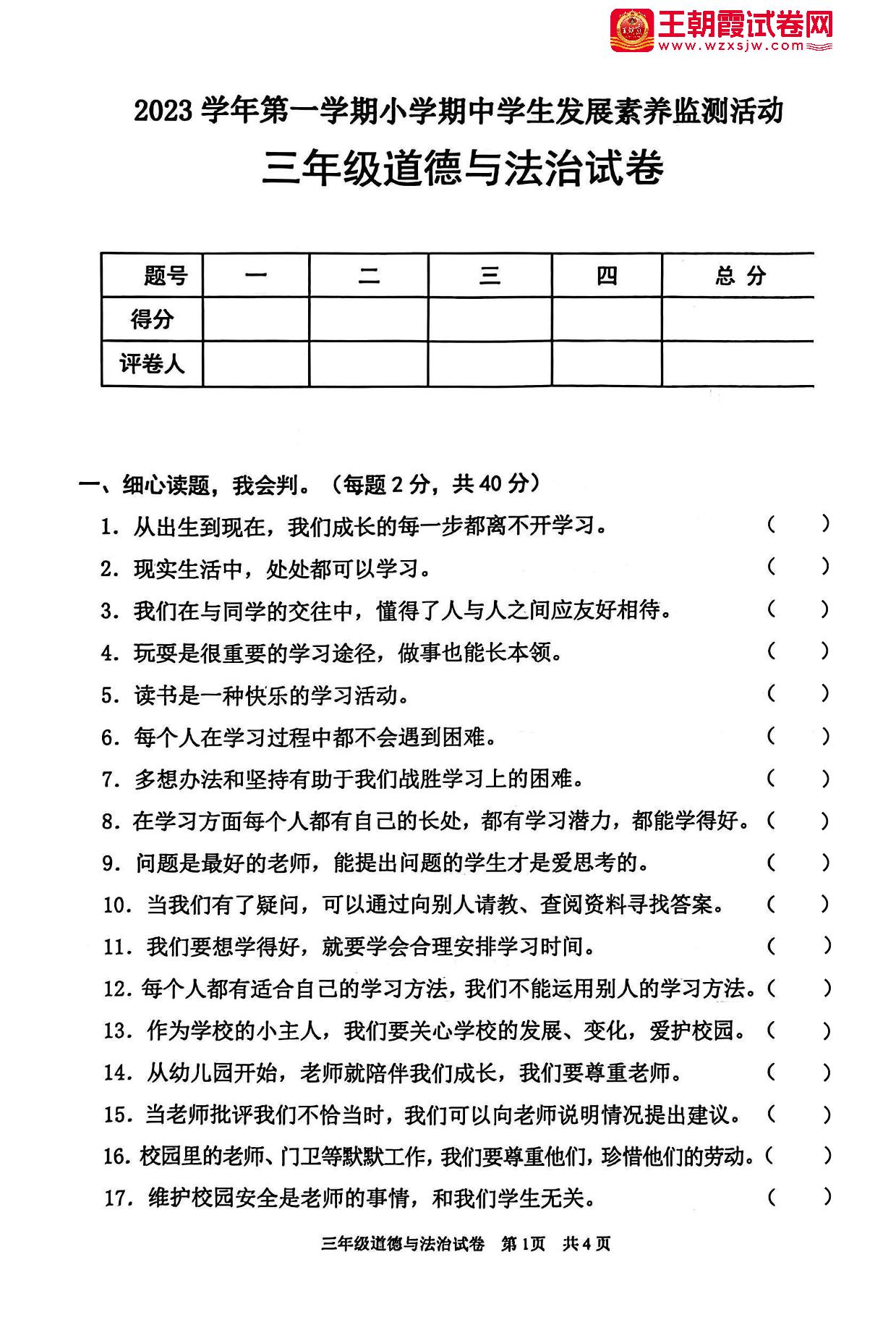 广东省清远市英德市2023-2024学年第一学期小学期中学生发展素养监测活动试卷三年级道德与法治(人教版)