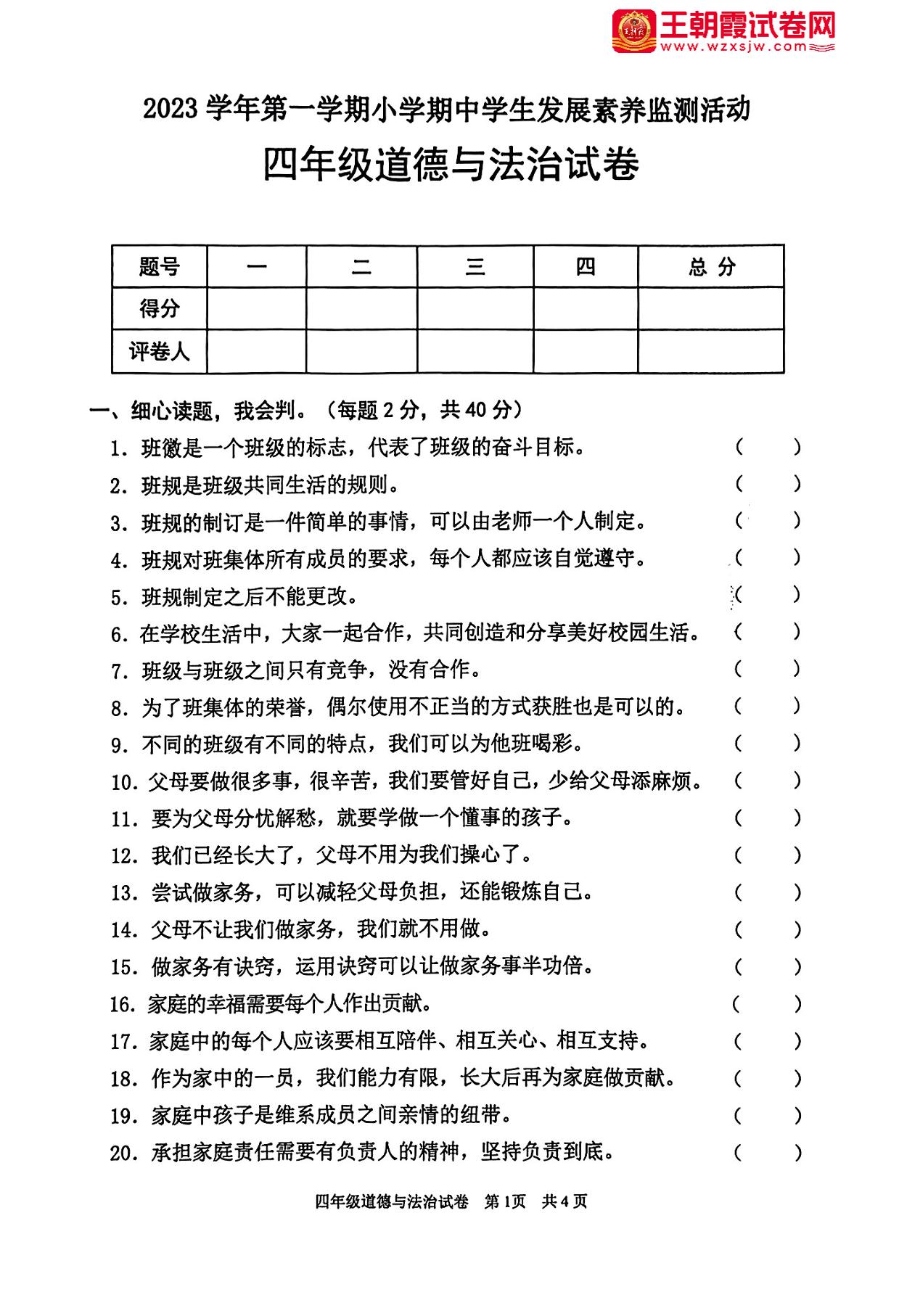广东省清远市英德市2023-2024学年第一学期小学期中学生发展素养监测活动试卷四年级道德与法治(人教版)