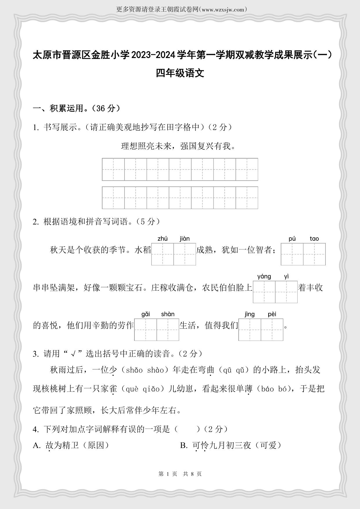山西省太原市晋源区金胜小学2023-2024学年第一学期双减教学成果展示(期中)四年级语文(人教版)