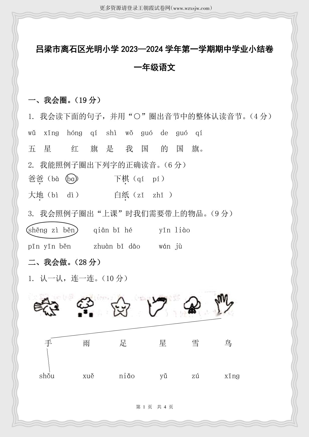 山西省吕梁市离石区光明小学2023-2024学年第一学期期中学业小结卷一年级语文(人教版)