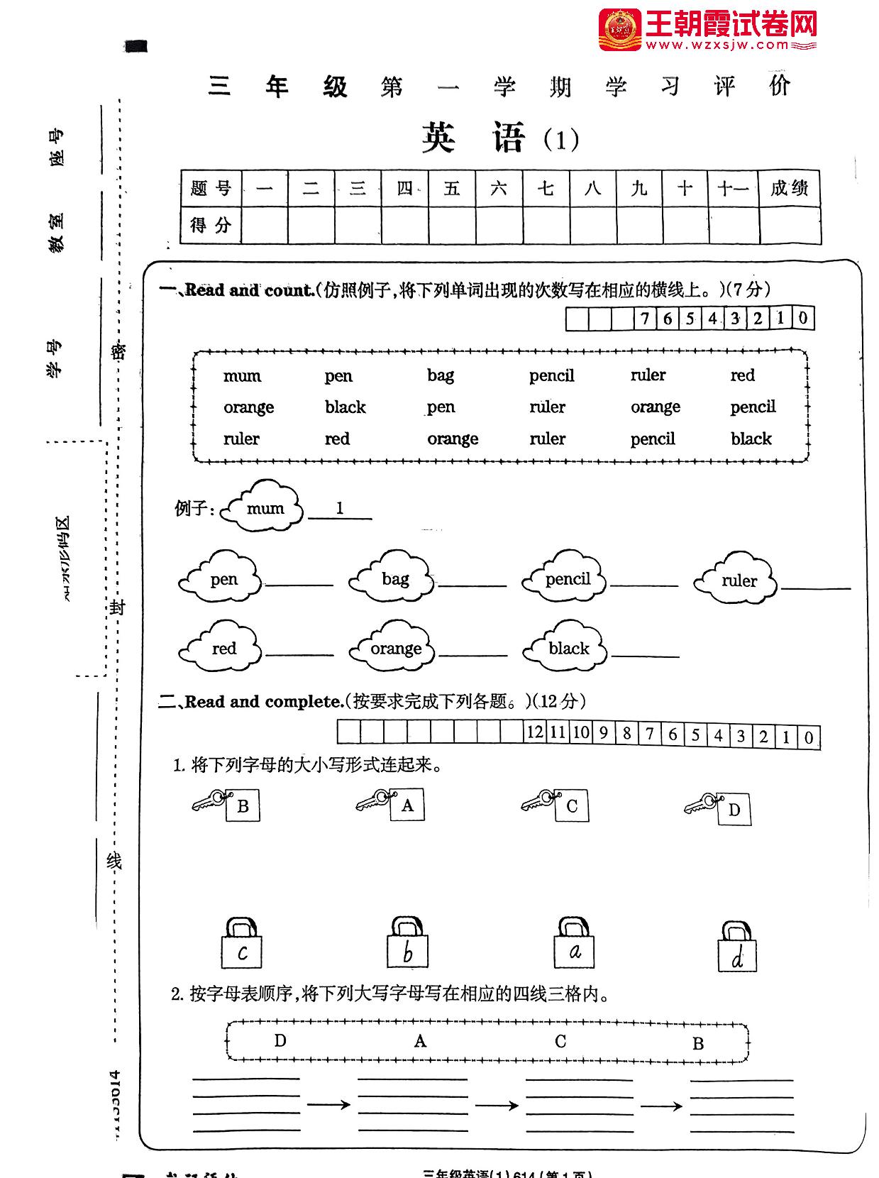 山西省晋中市榆社县箕城小学2023-2024学年第一学期学习评价(月考)三年级英语(人教PEP版)