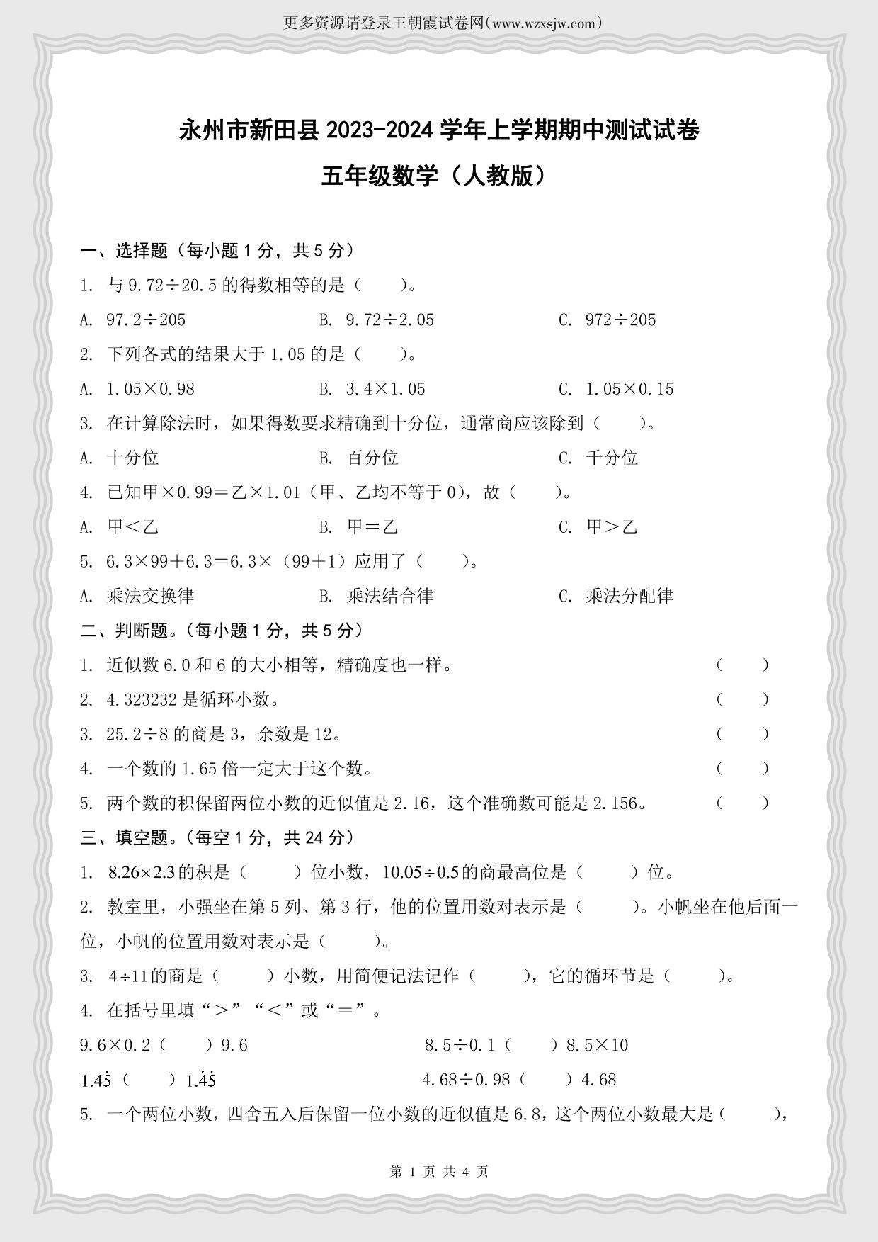 湖南省永州市新田县2023-2024学年上学期期中考试试卷五年级数学(人教版)