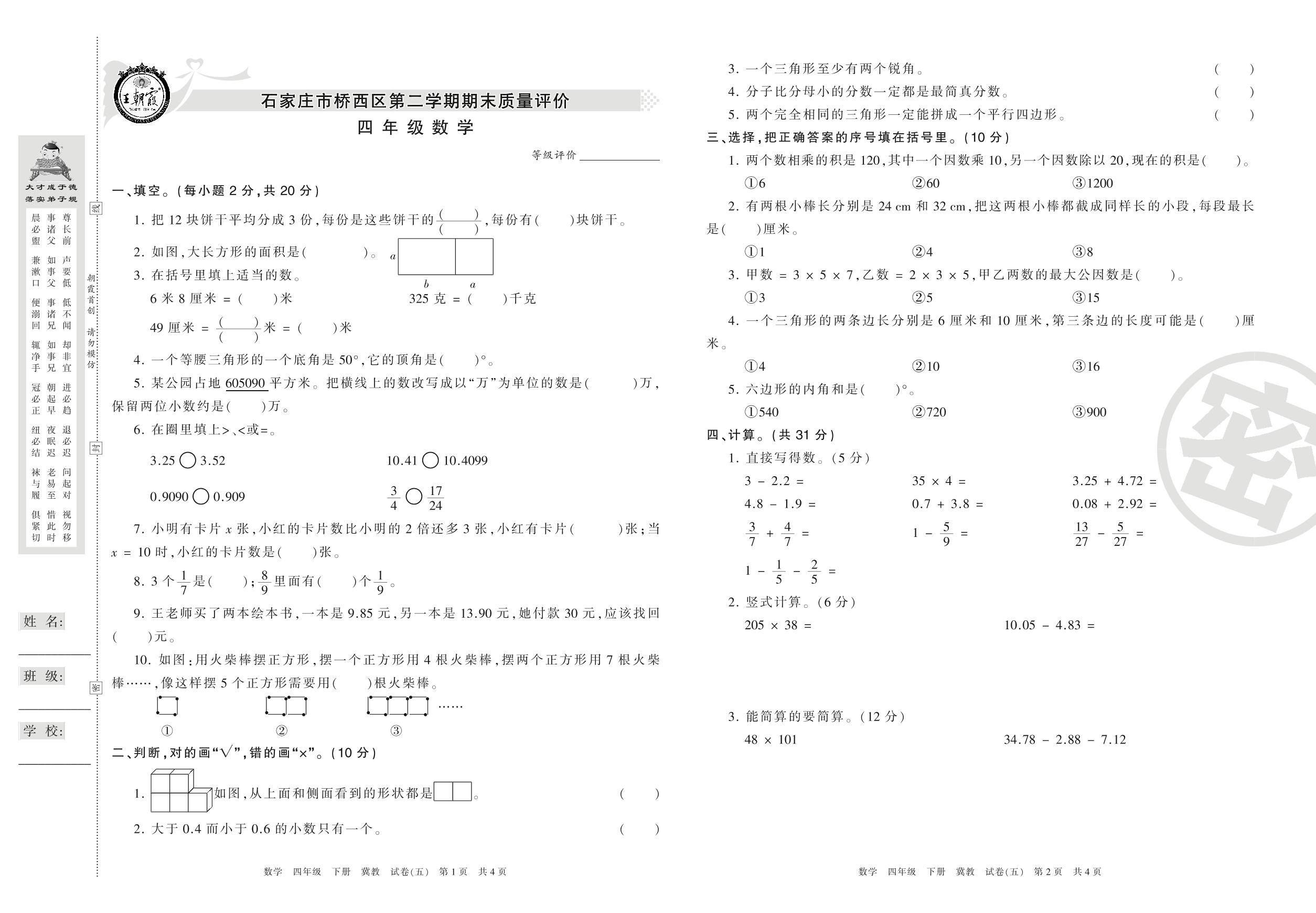 2015-2016学年第二学期石家庄市桥西区四年级数学试卷(冀教版)【5】