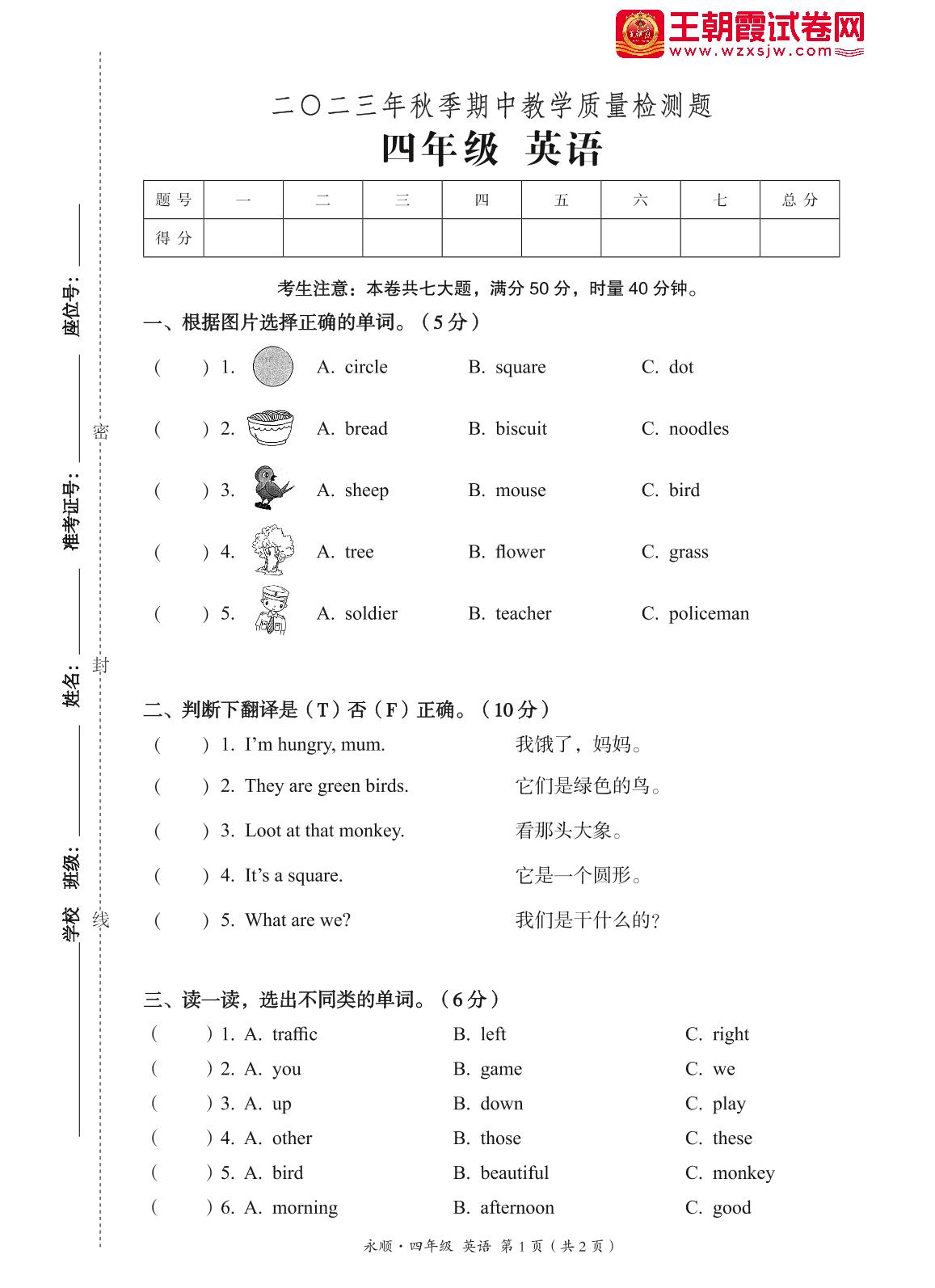 四年级英语湘少版上册期中卷