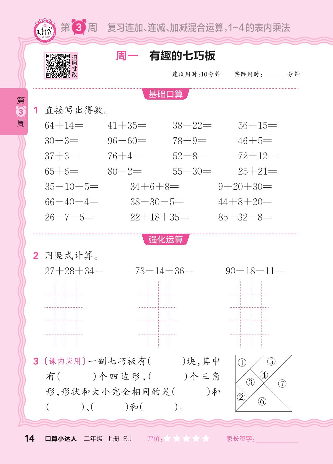 2024秋上册二年级数学苏教版 口算计算专练 第3周