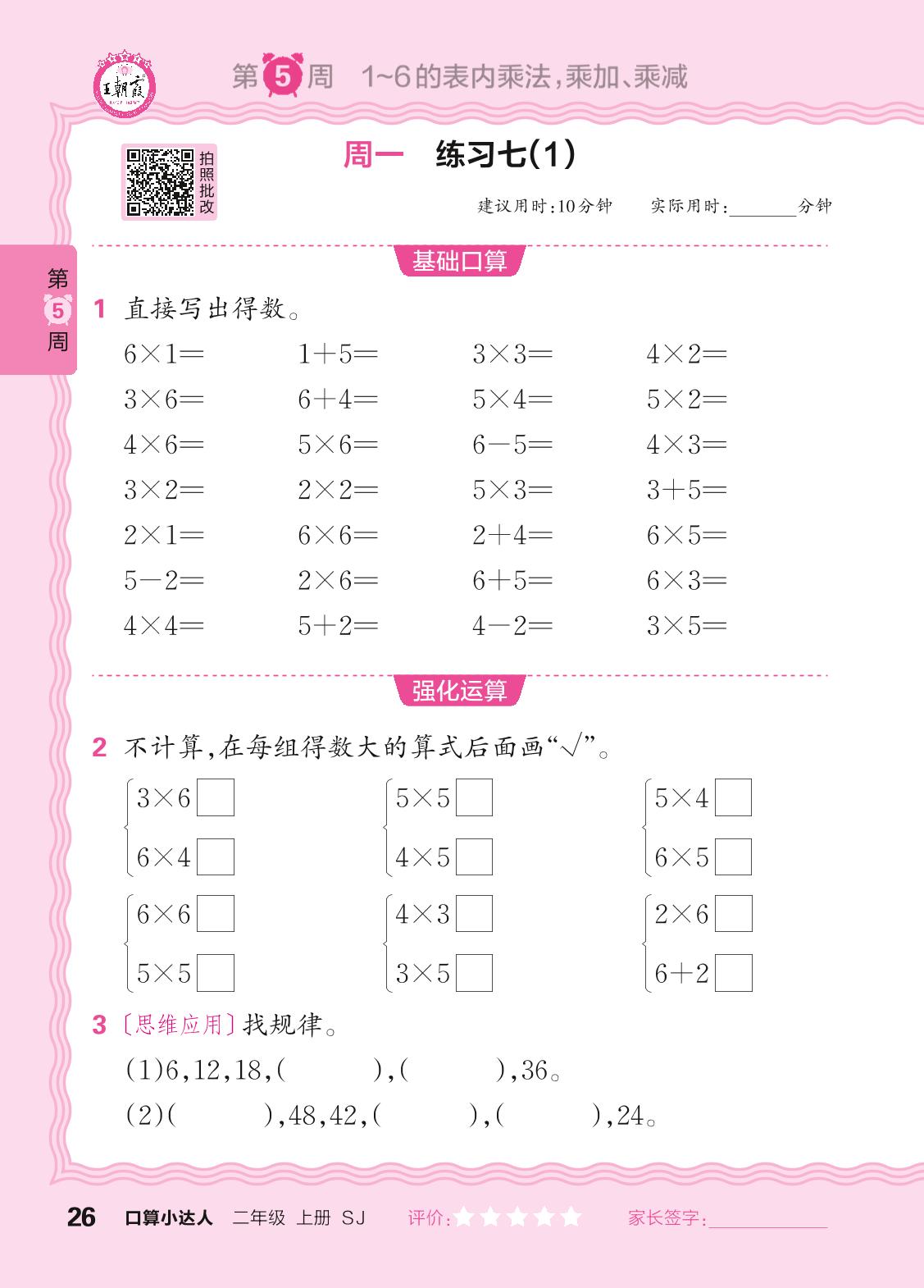 2024秋上册二年级数学苏教版 口算计算专练 第5周