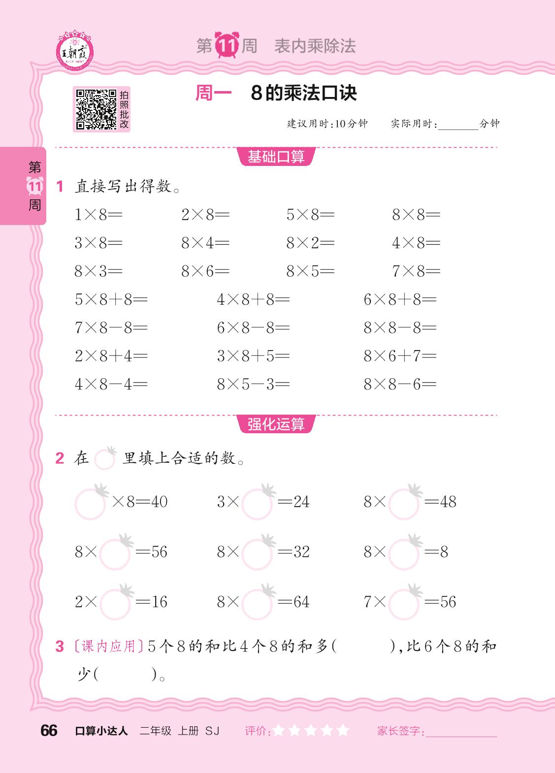 2024秋上册二年级数学苏教版 口算计算专练 第11周