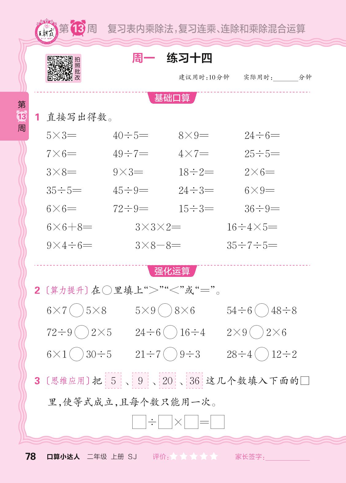 2024秋上册二年级数学苏教版 口算计算专练 第13周