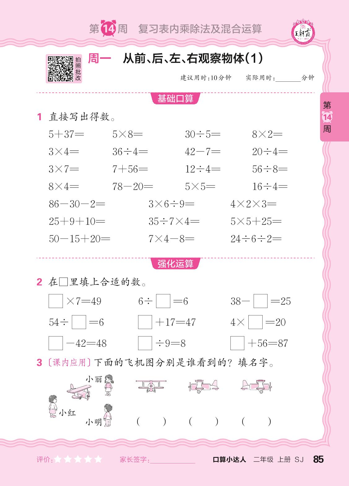 2024秋上册二年级数学苏教版 口算计算专练 第14周