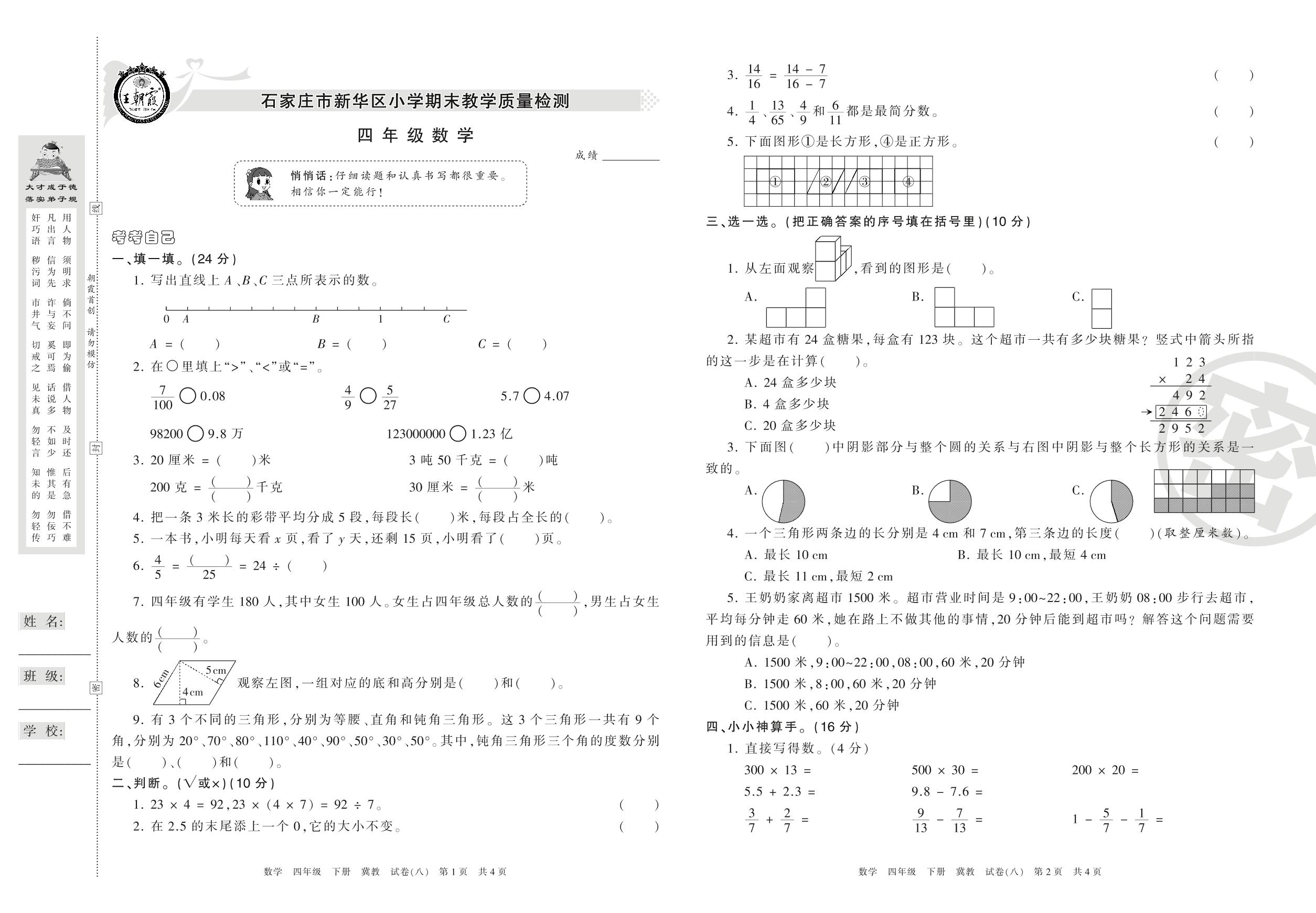 2015-2016学年第二学期石家庄市新华区四年级数学试卷(冀教版)【8】