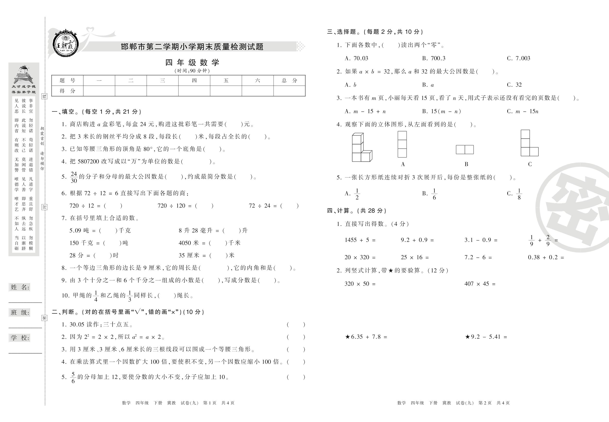 2015-2016学年第二学期邯郸市四年级数学试卷(冀教版)【9】
