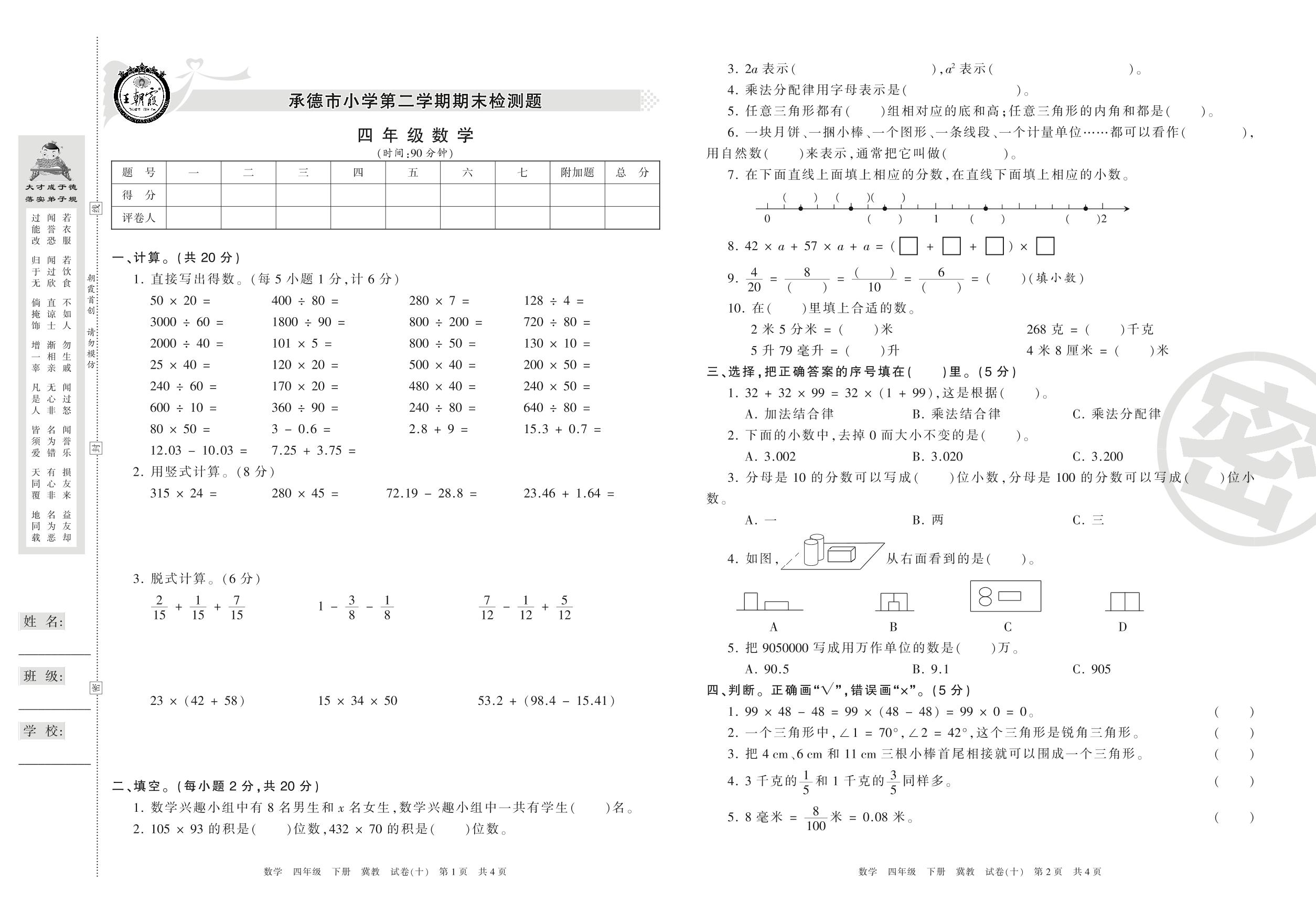 2015-2016学年第二学期承德市四年级数学试卷(冀教版)【10】