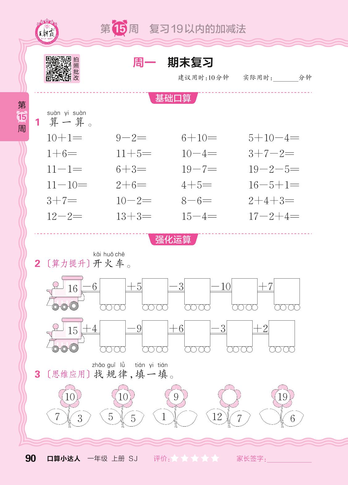 2024秋上册一年级数学苏教版 口算计算专练 第15周
