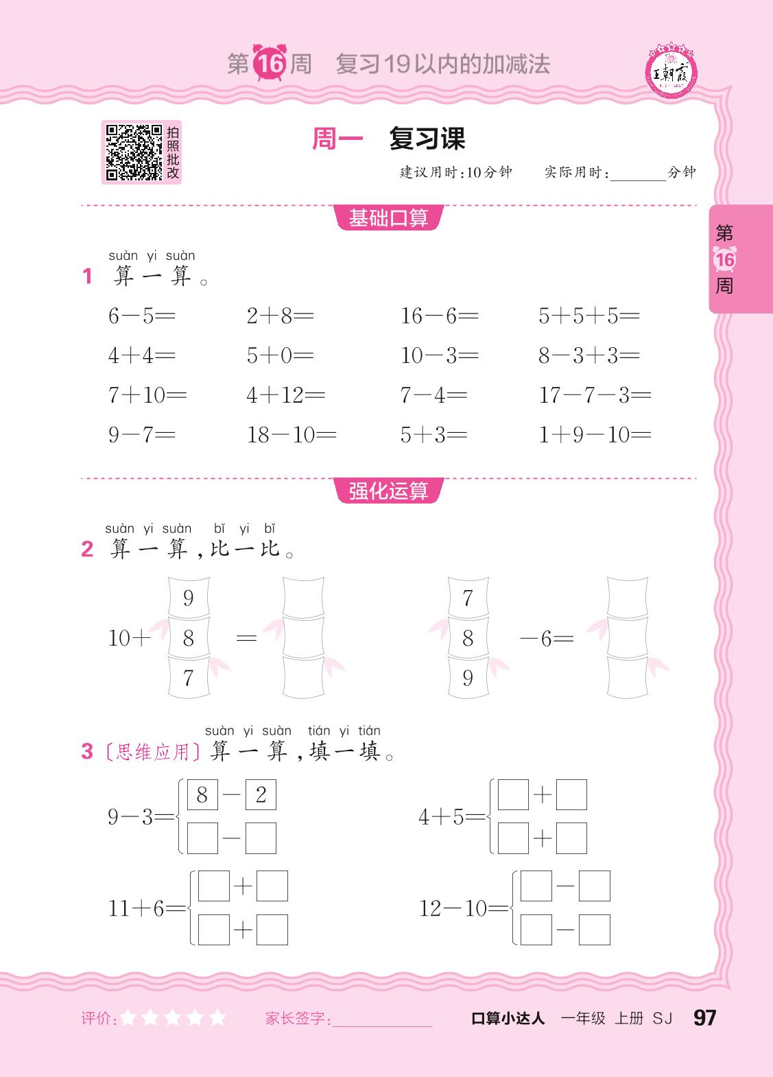2024秋上册一年级数学苏教版 口算计算专练 第16周