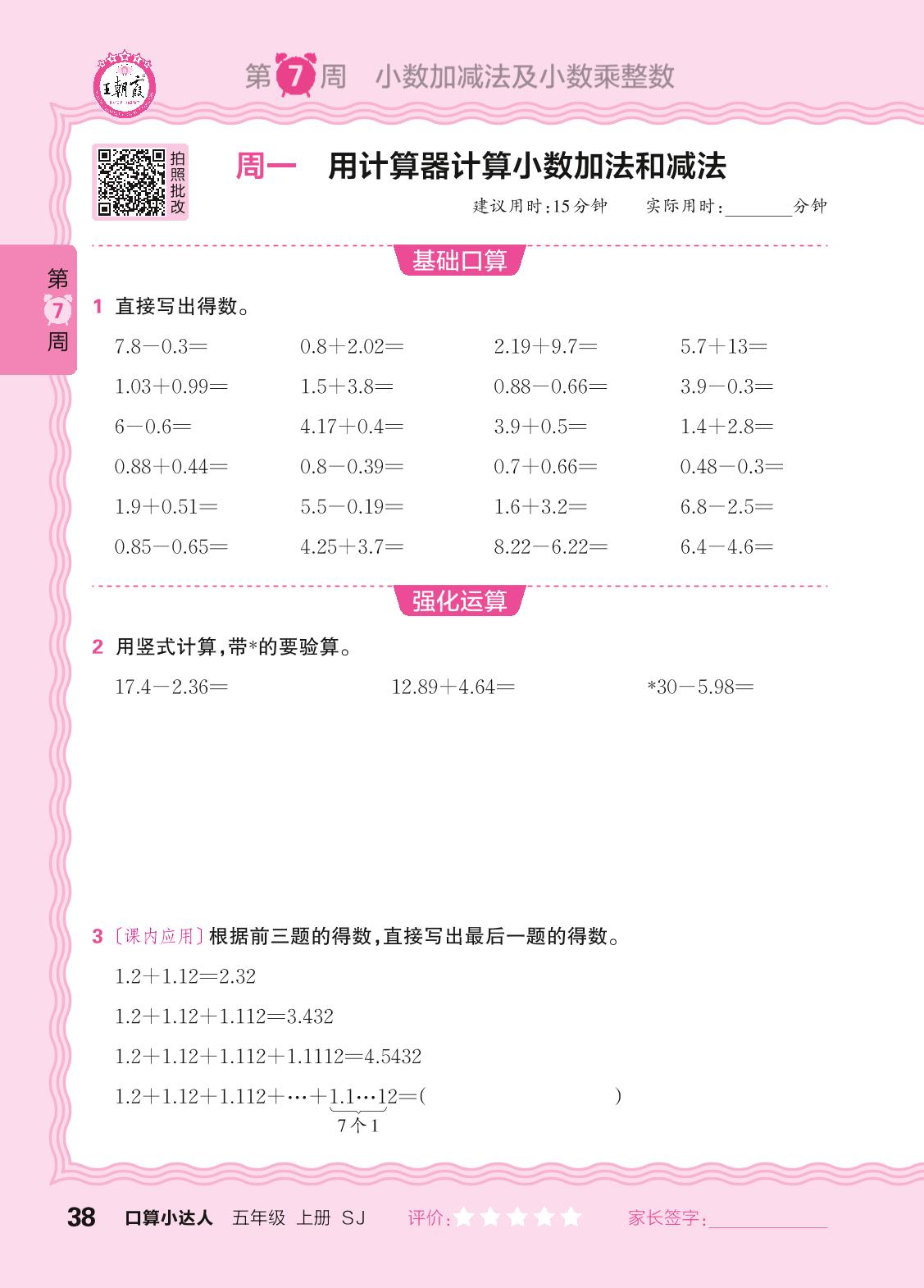 2024秋上册五年级数学苏教版 口算计算专练 第7周