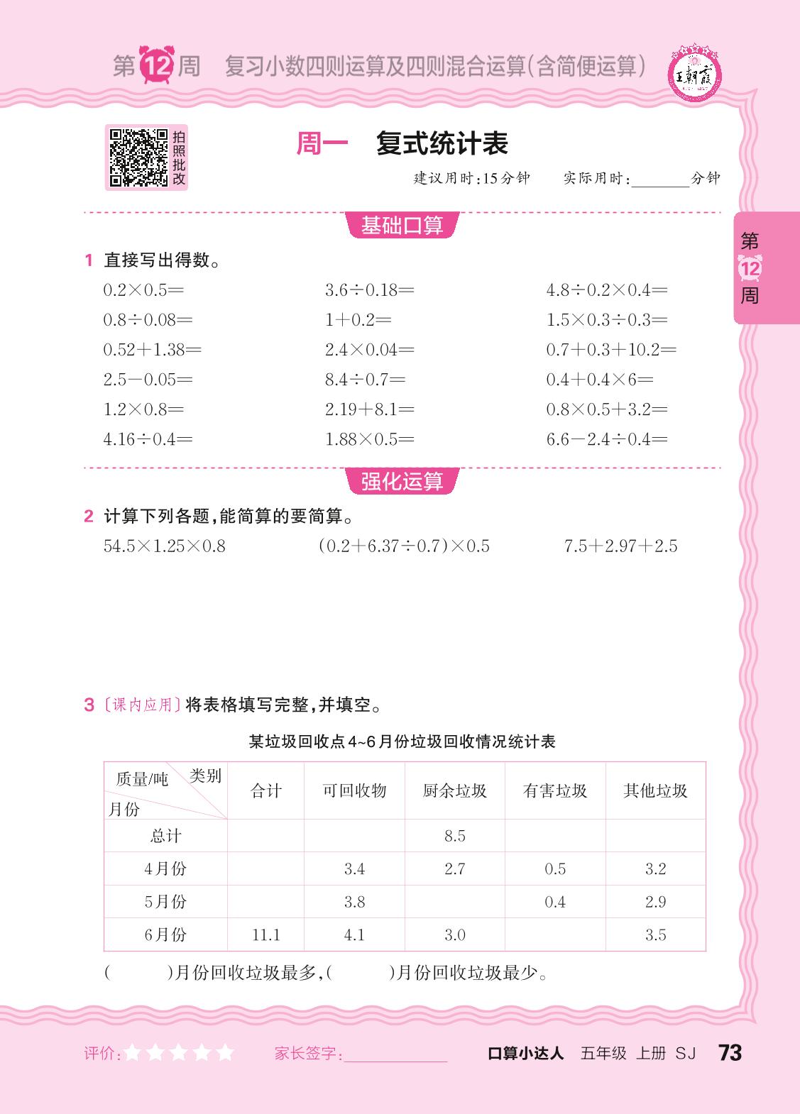 2024秋上册五年级数学苏教版 口算计算专练 第12周