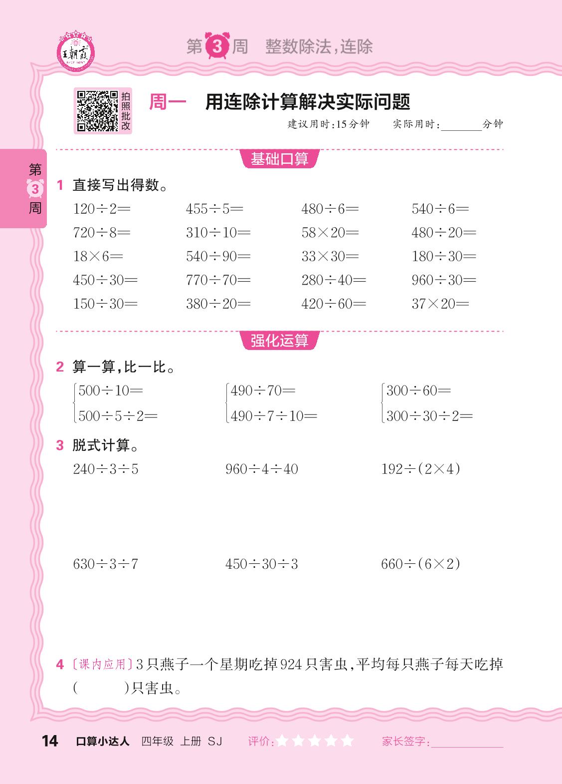 2024秋上册四年级数学苏教版 口算计算专练 第3周