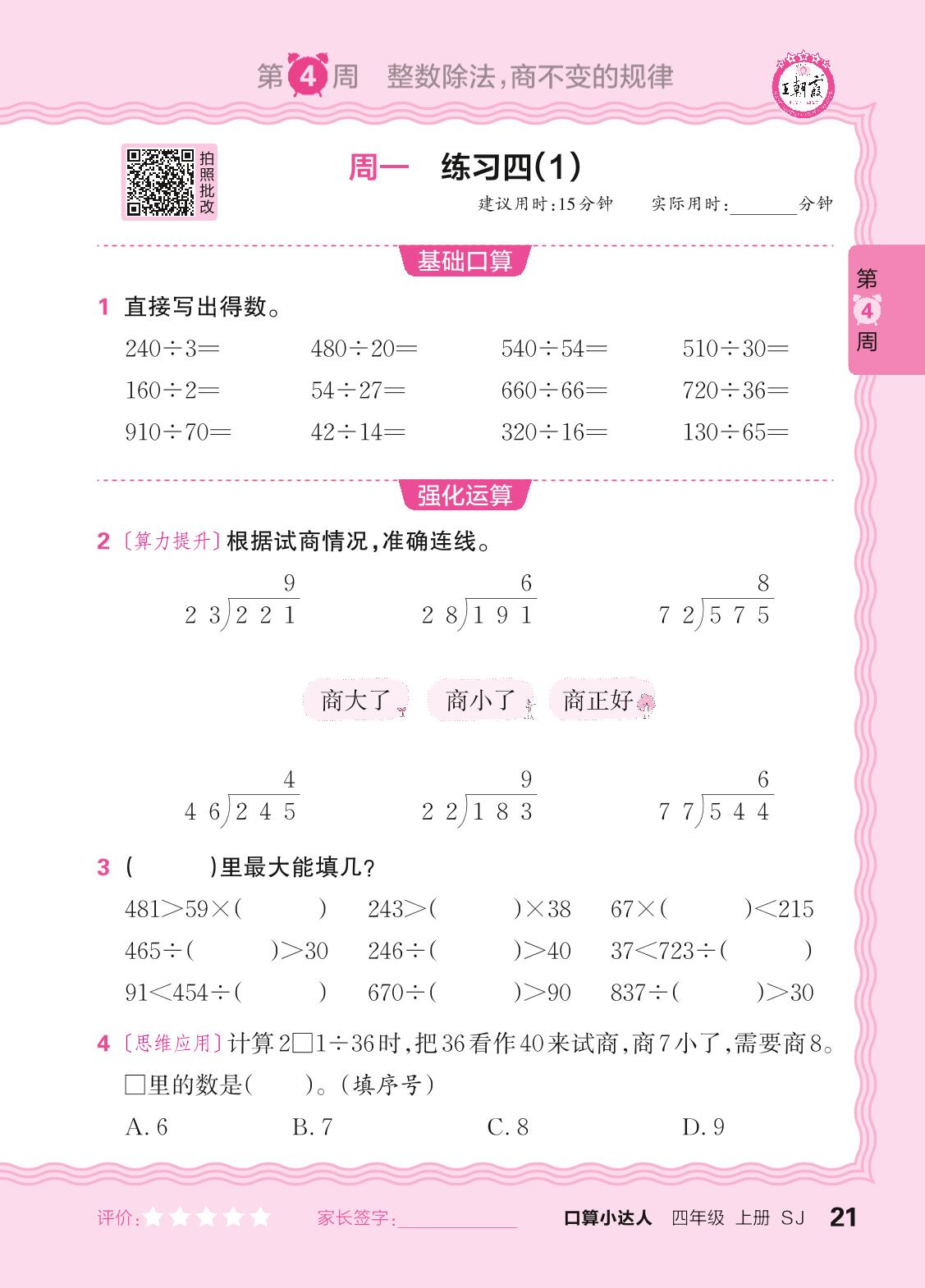 2024秋上册四年级数学苏教版 口算计算专练 第4周