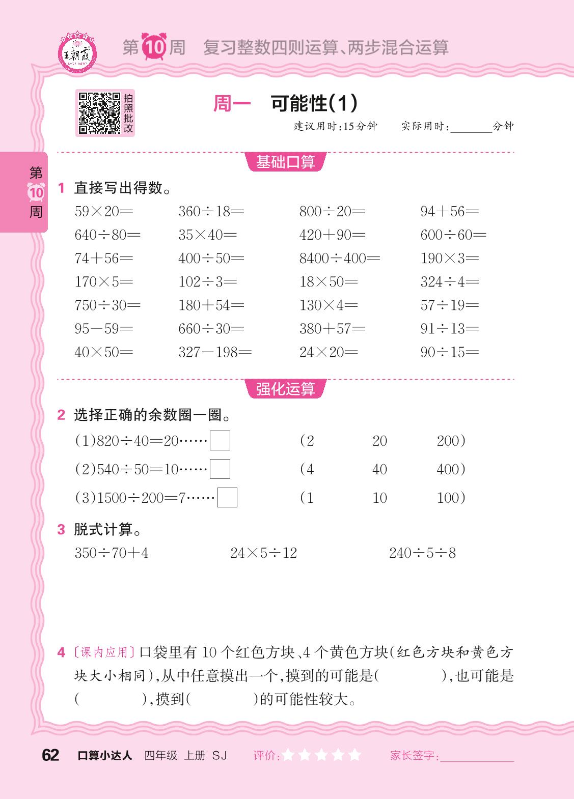 2024秋上册四年级数学苏教版 口算计算专练 第10周