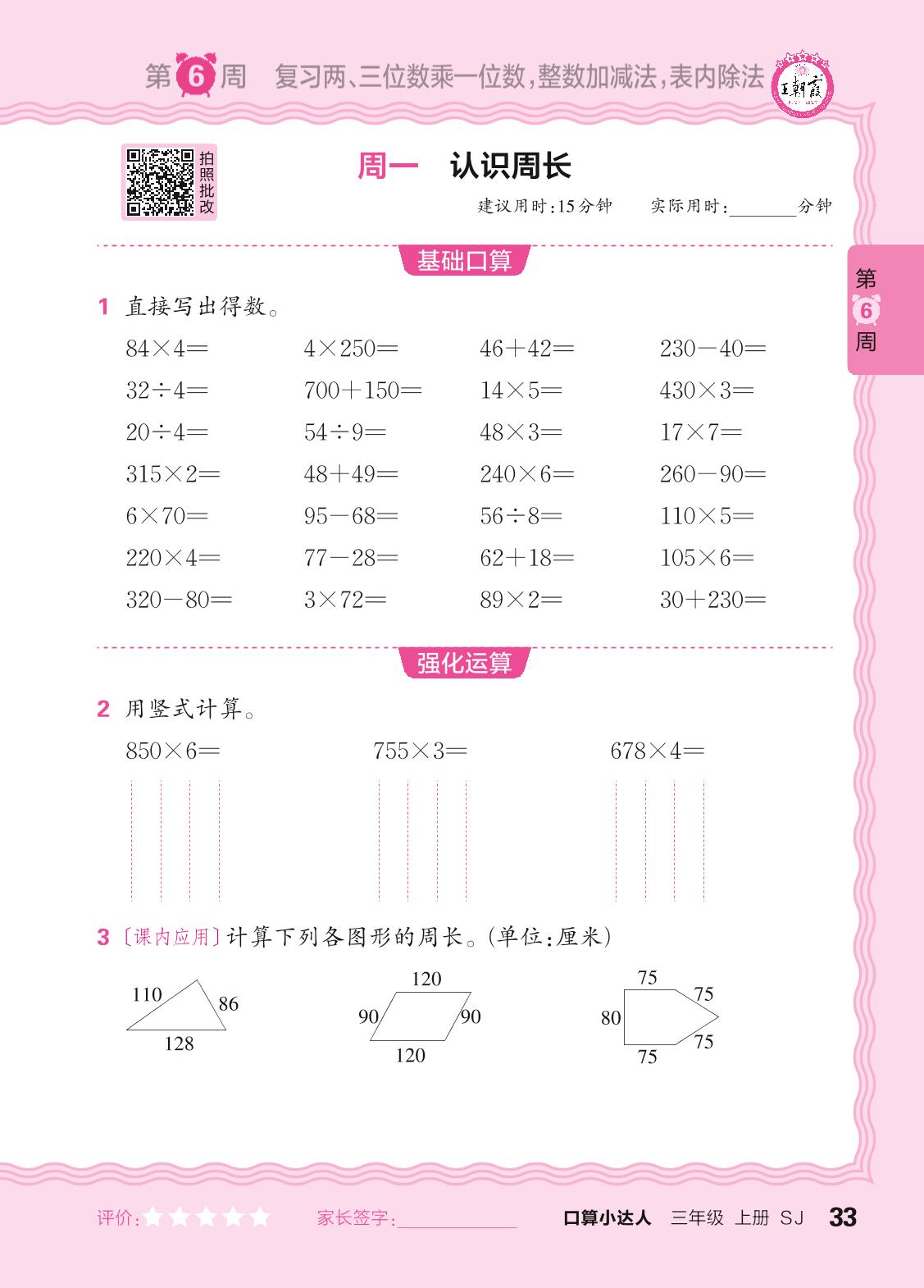 2024秋上册三年级数学苏教版 口算计算专练 第6周