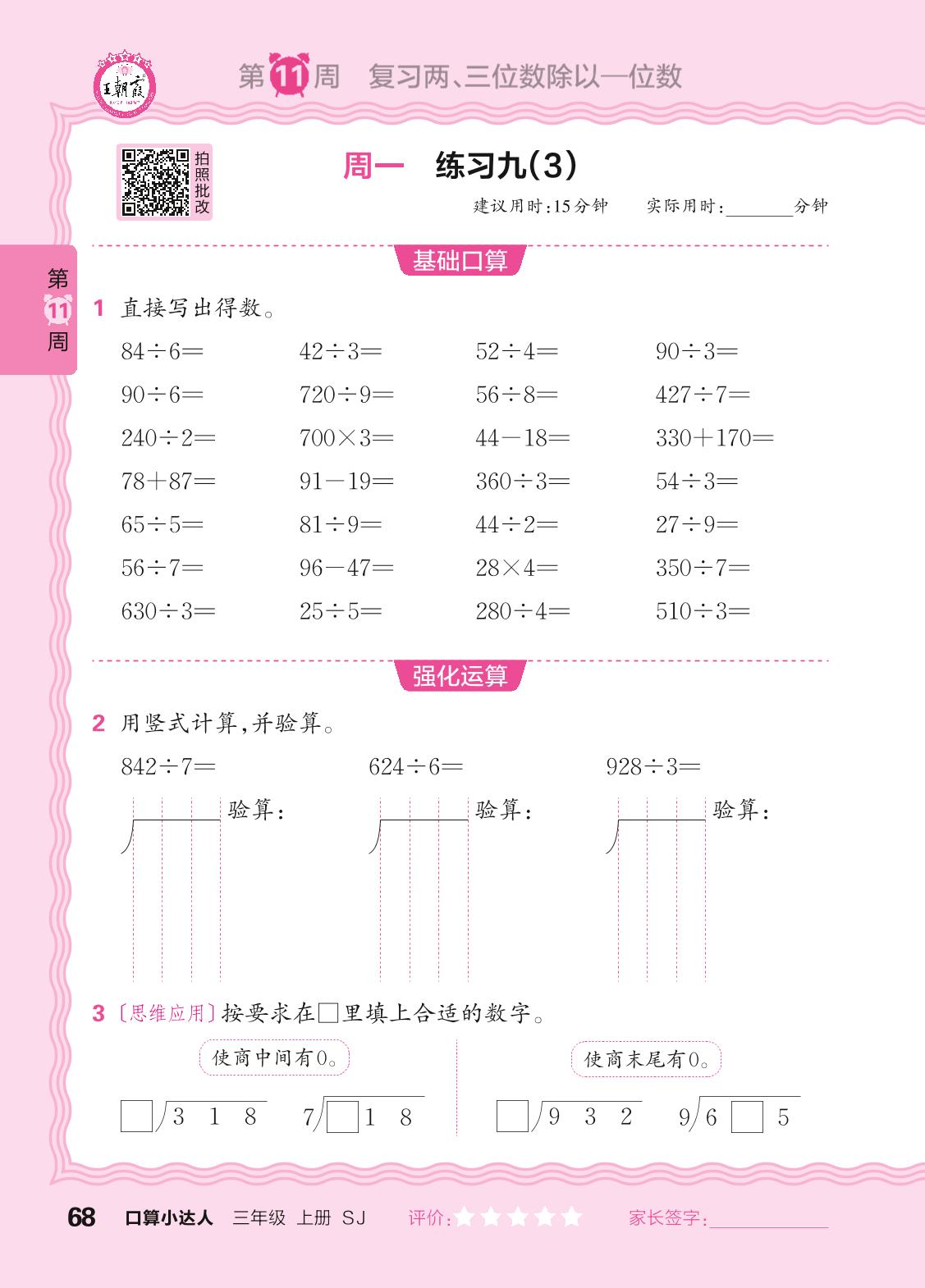 2024秋上册三年级数学苏教版 口算计算专练 第11周