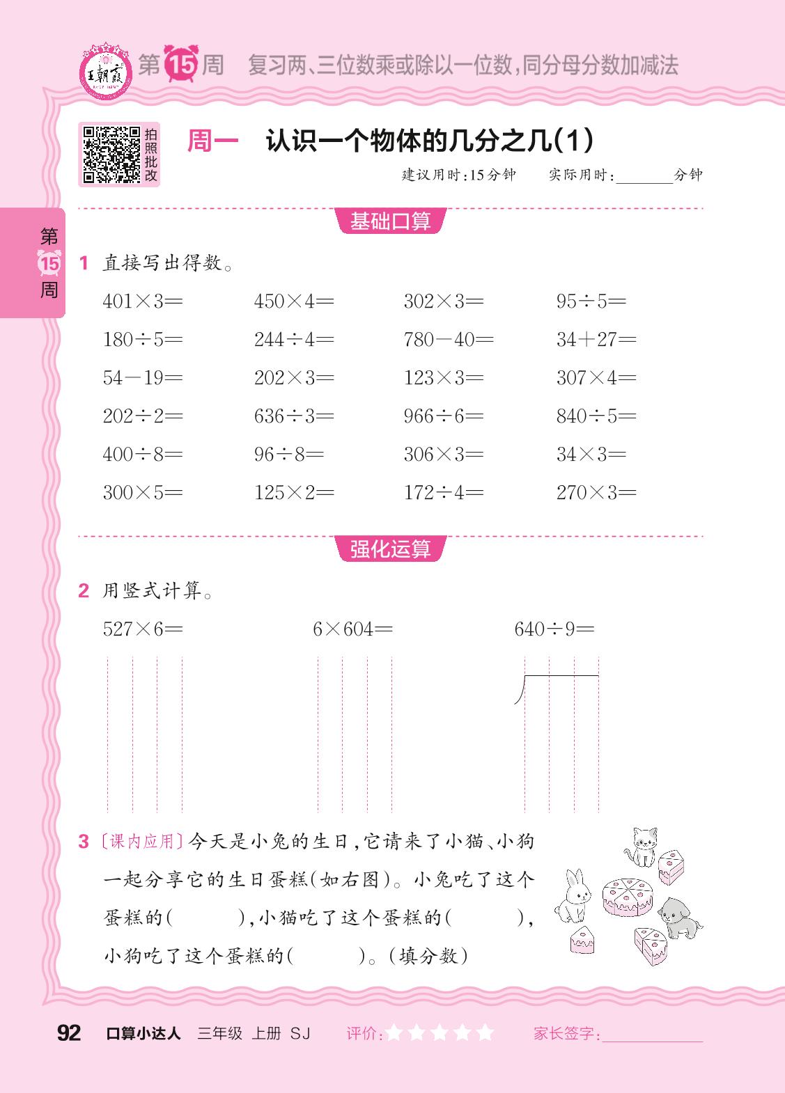 2024秋上册三年级数学苏教版 口算计算专练 第15周