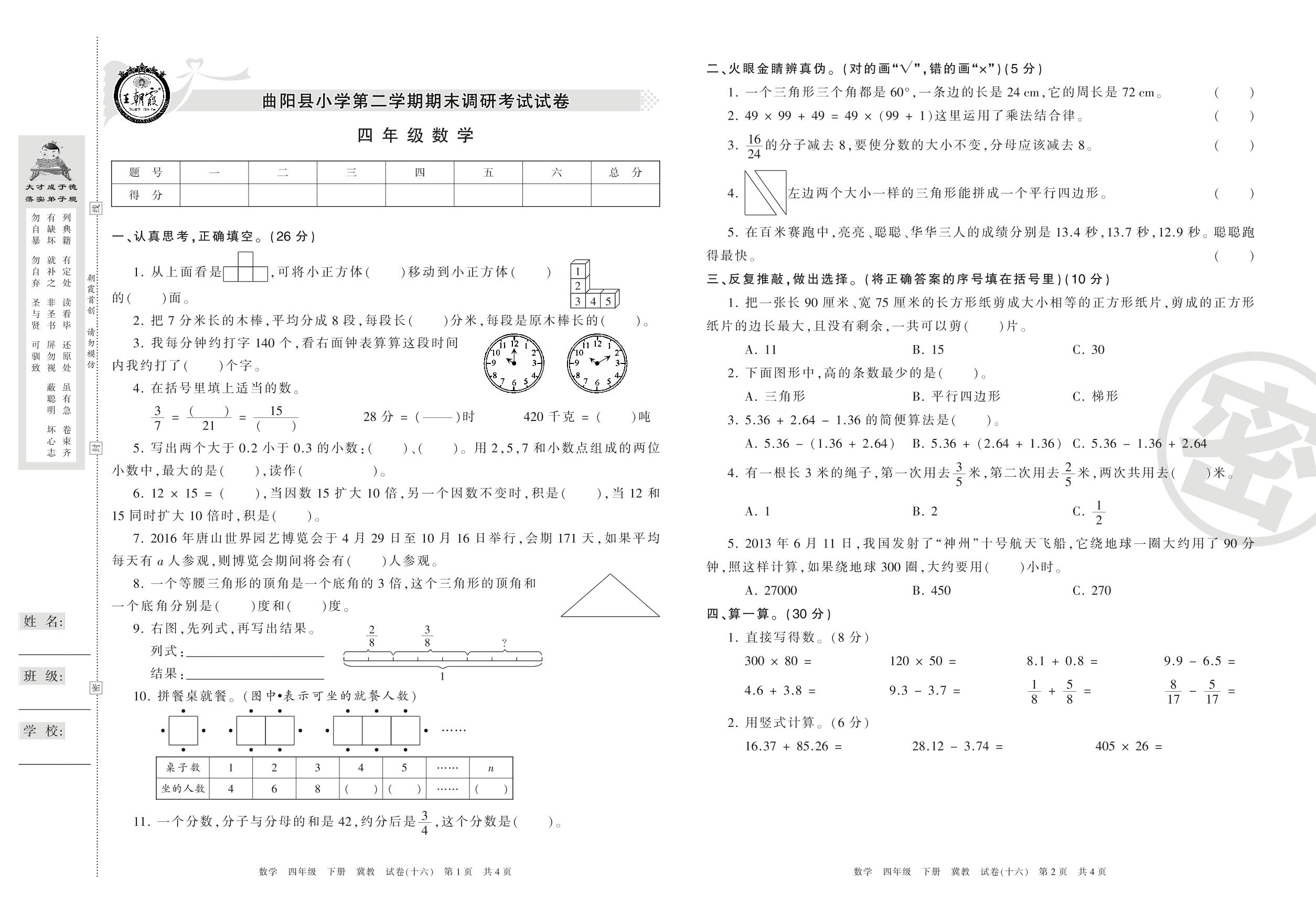 2015-2016学年第二学期保定市曲阳县四年级数学试卷(冀教版)【16】