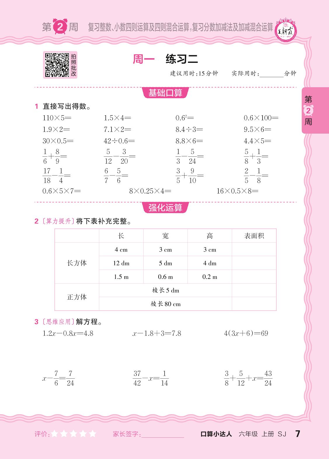 2024秋上册六年级数学苏教版 口算计算专练 第2周