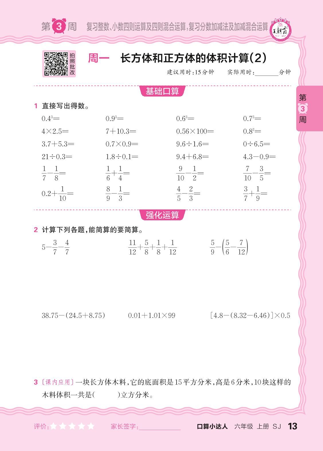 2024秋上册六年级数学苏教版 口算计算专练 第3周