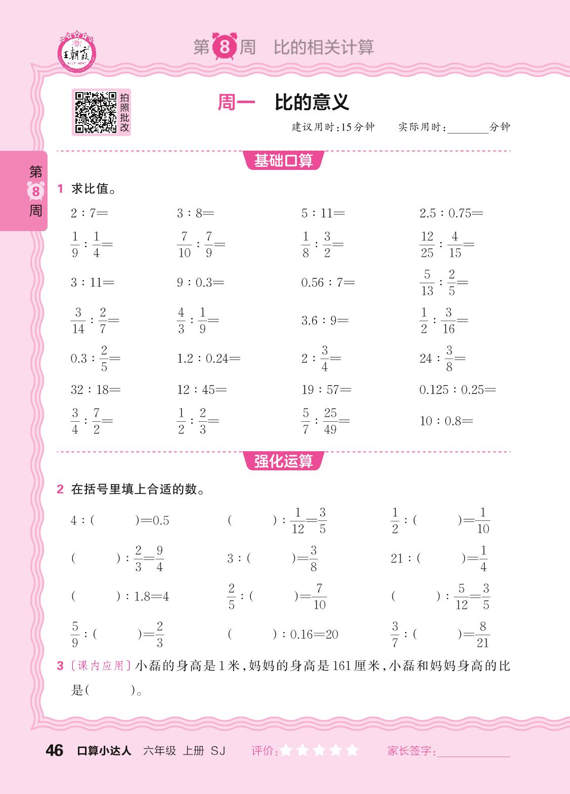 2024秋上册六年级数学苏教版 口算计算专练 第8周