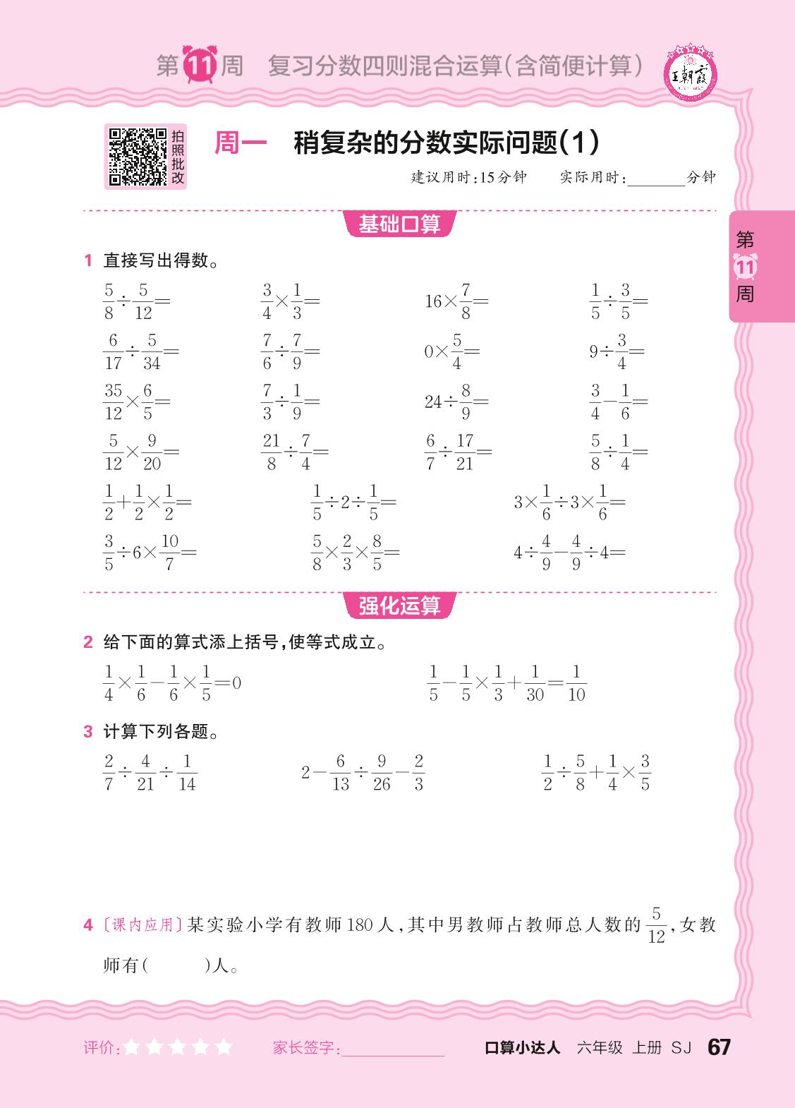 2024秋上册六年级数学苏教版 口算计算专练 第11周