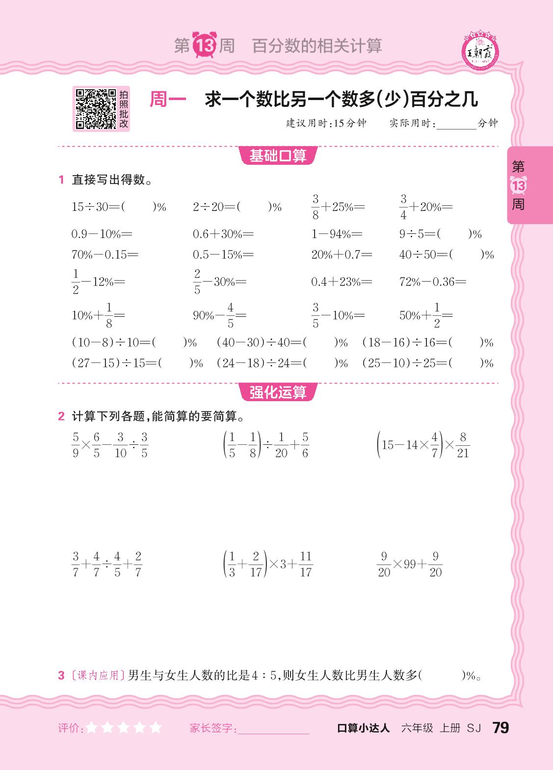 2024秋上册六年级数学苏教版 口算计算专练 第13周