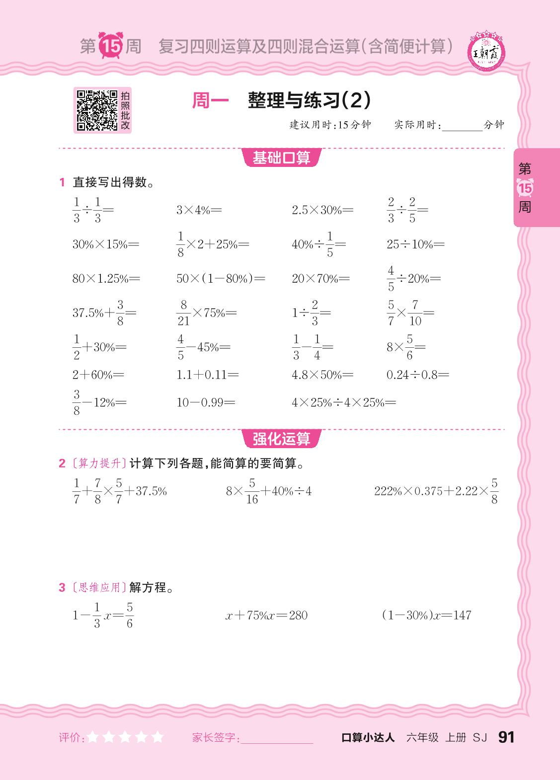2024秋上册六年级数学苏教版 口算计算专练 第15周