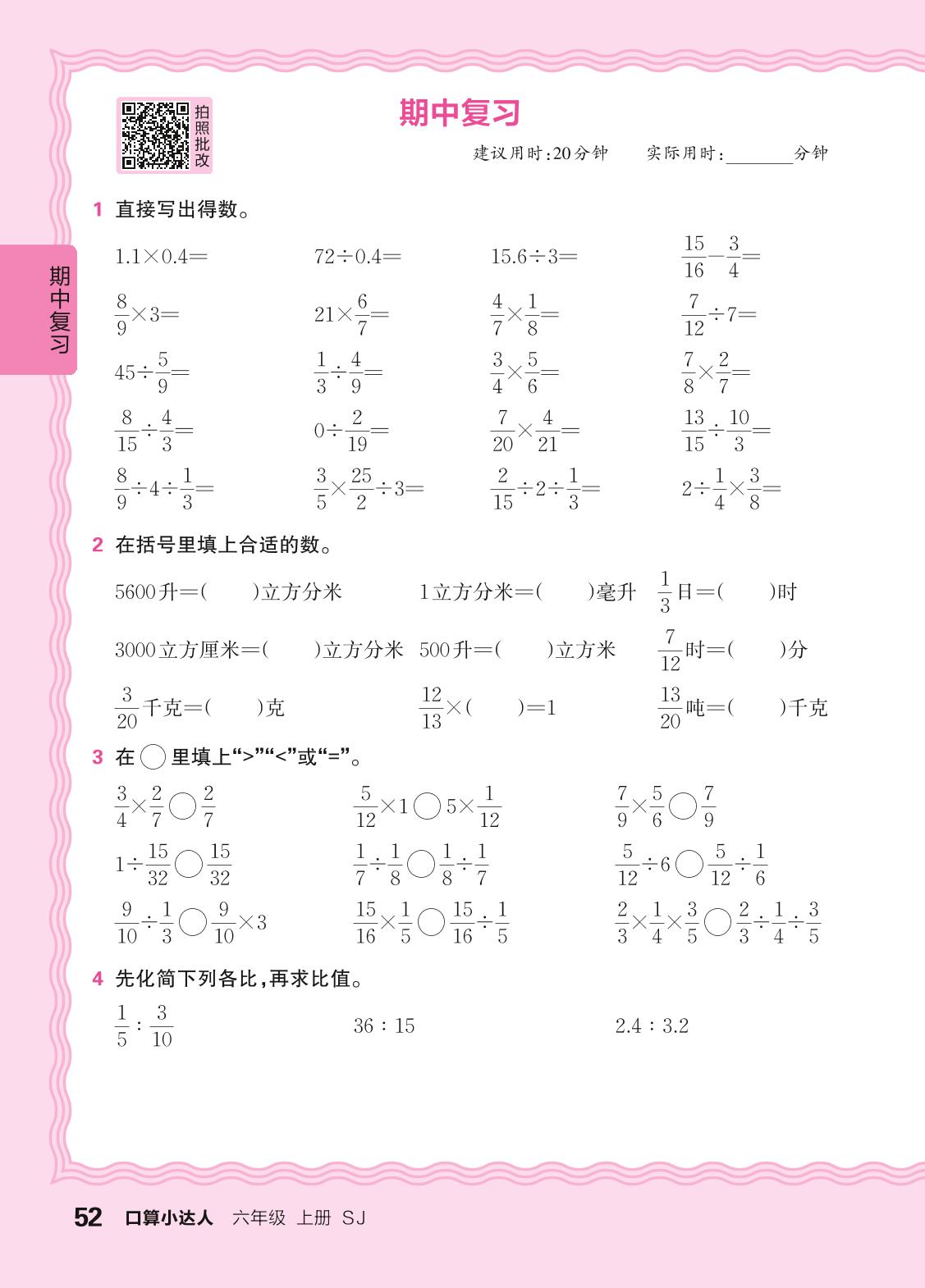 2024秋上册六年级数学苏教版 期中复习(计算专练)