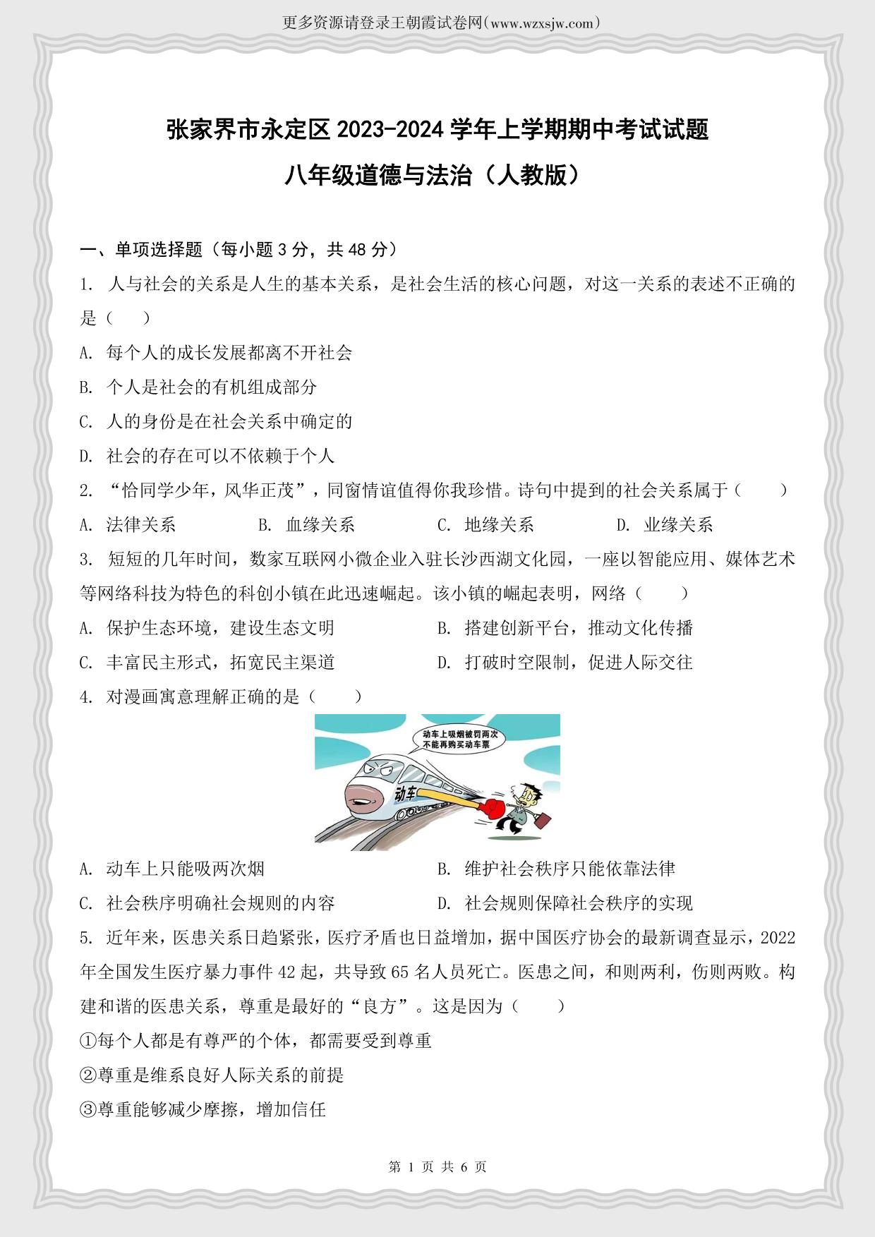 湖南省张家界市永定区2023-2024学年上学期期中考试试题八年级道德与法治(人教版)