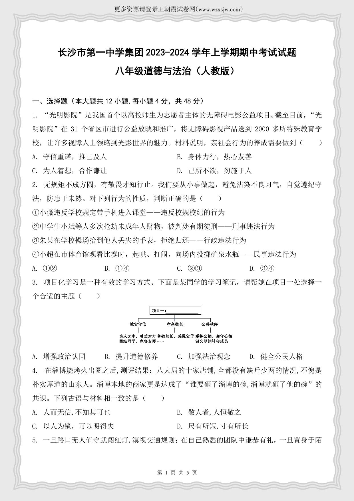 湖南省长沙市第一中学集团2023-2024学年上学期期中考试试题八年级道德与法治(人教版)