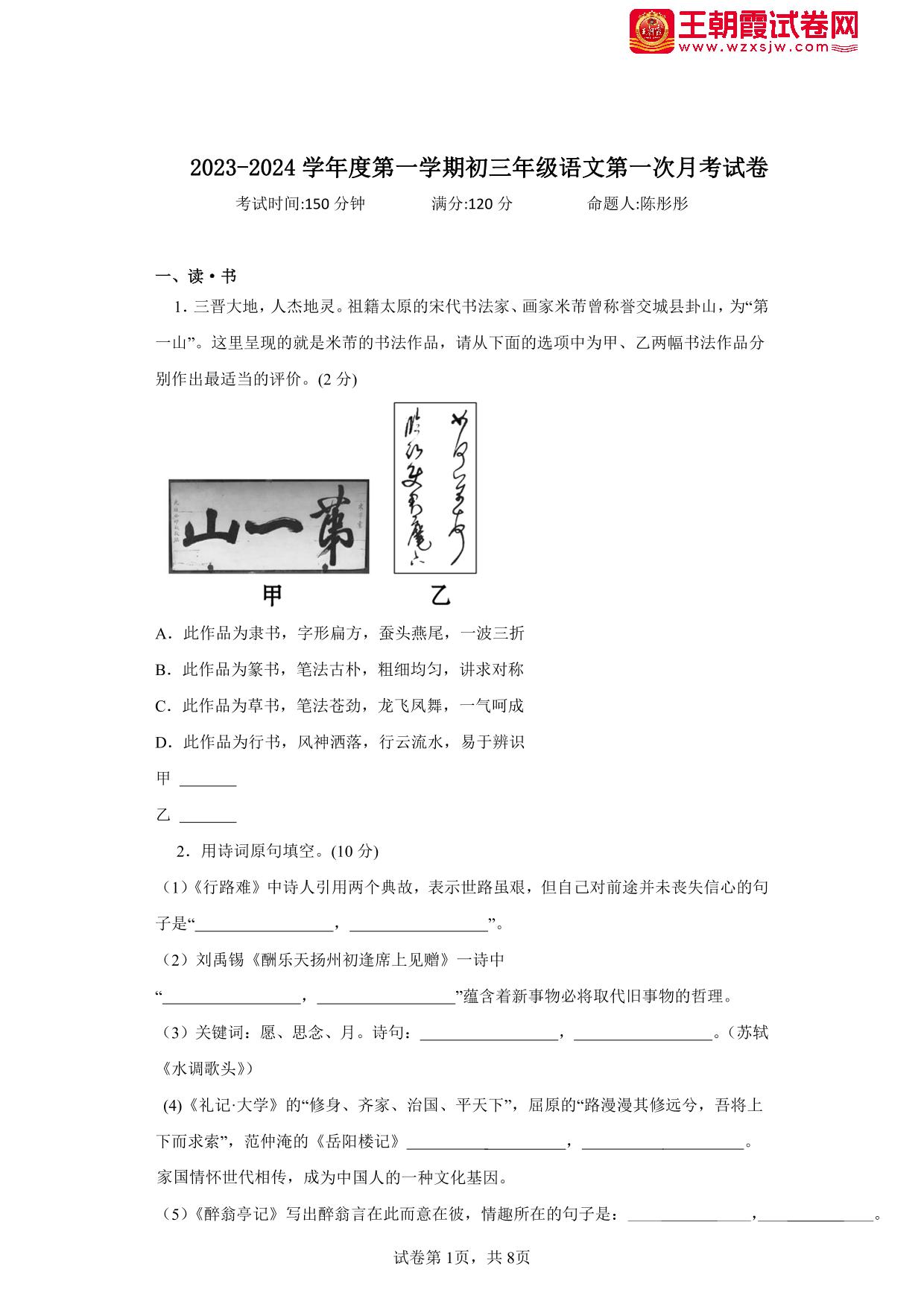 山西省临汾市洪洞县向明中学2023-2024学年度第一学期第一次月考试卷九年级语文(人教版)