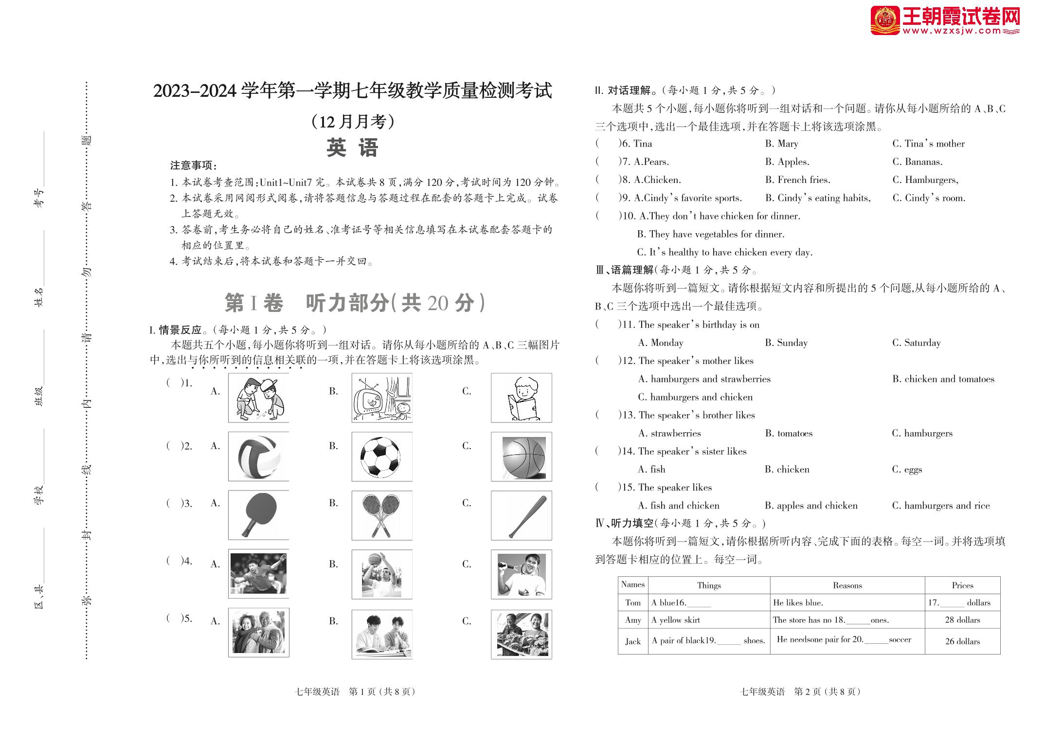 山西省太原市小店区2023-2024学年第一学期教学质量检测考试(月考)七年级英语(人教版)