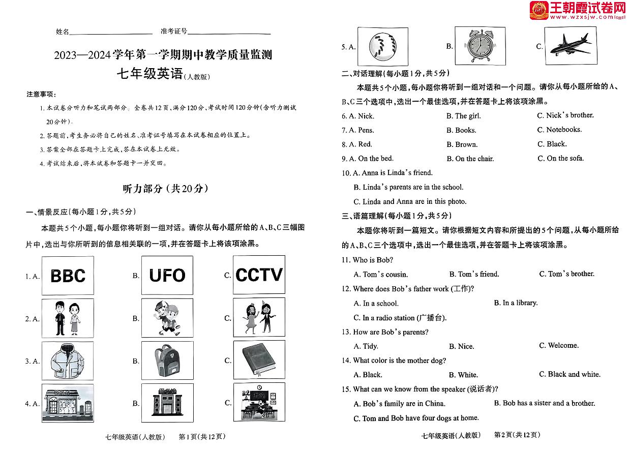 山西省大同市2023-2024学年第一学期期中教学质量监测七年级英语(人教版)【无听力音频】