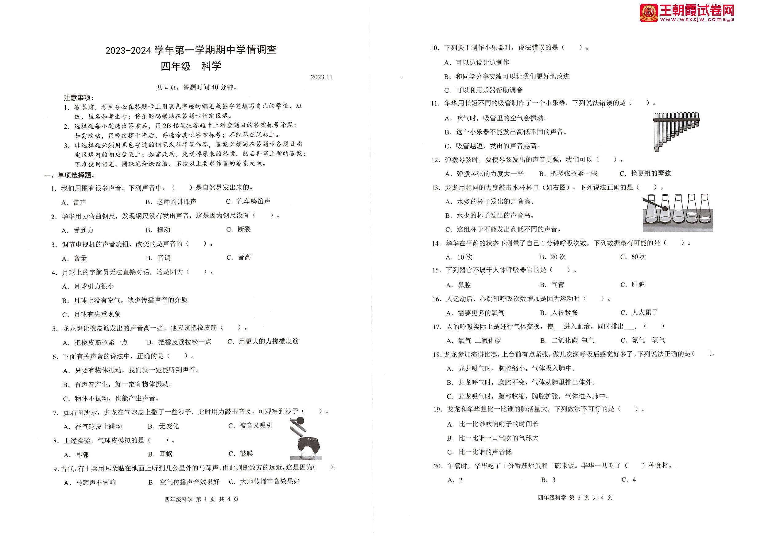 广东省深圳市龙华区2023-2024学年度第一学期期中学情调查试卷四年级科学(教科版)