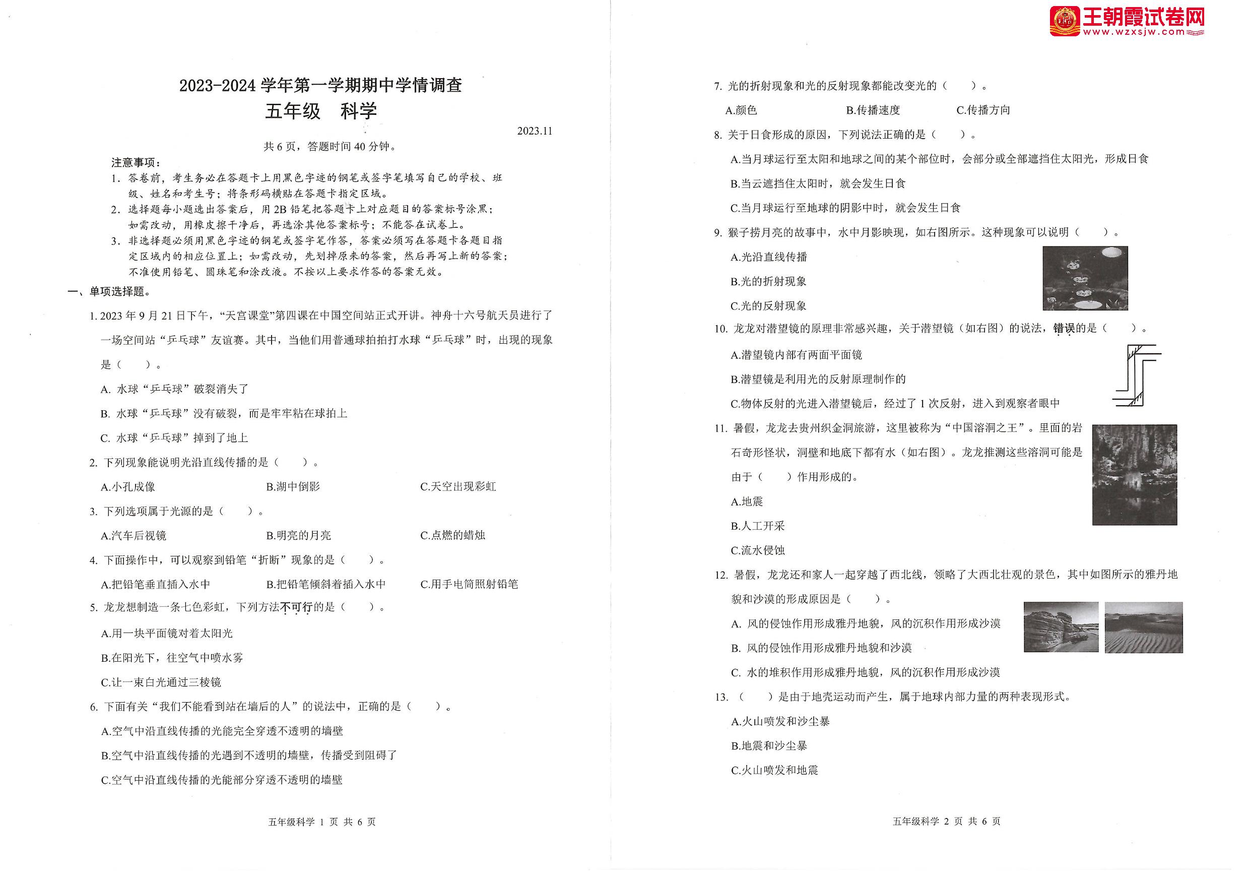 广东省深圳市龙华区2023-2024学年度第一学期期中学情调查试卷五年级科学(教科版)