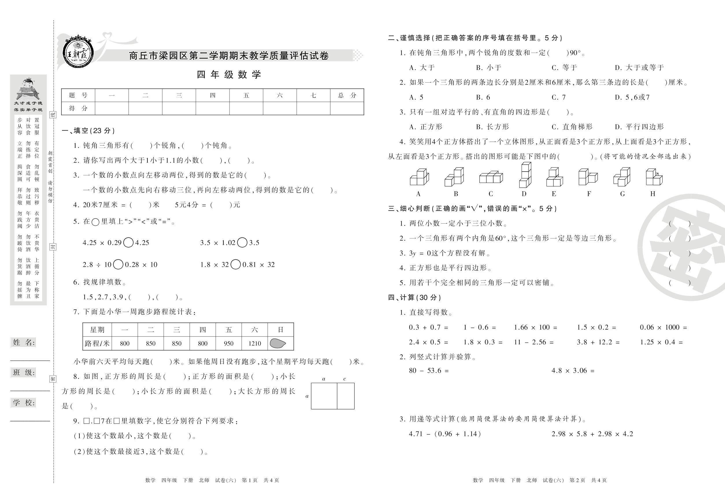 2015-2016学年第二学期商丘市梁园区四年级数学试卷(北师版)【6】