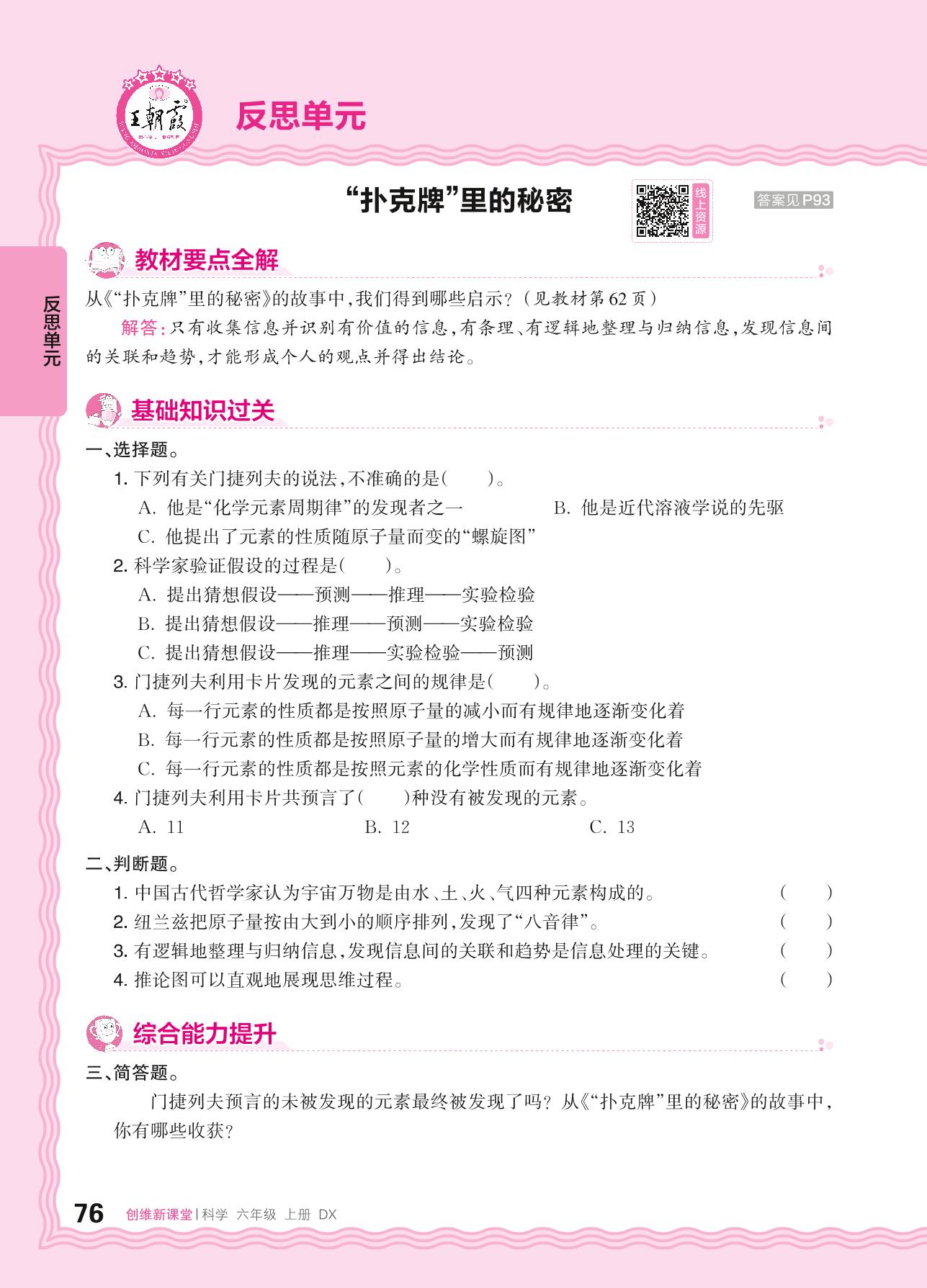2024秋上册六年级科学大象版 反思单元——“扑克牌”里的秘密