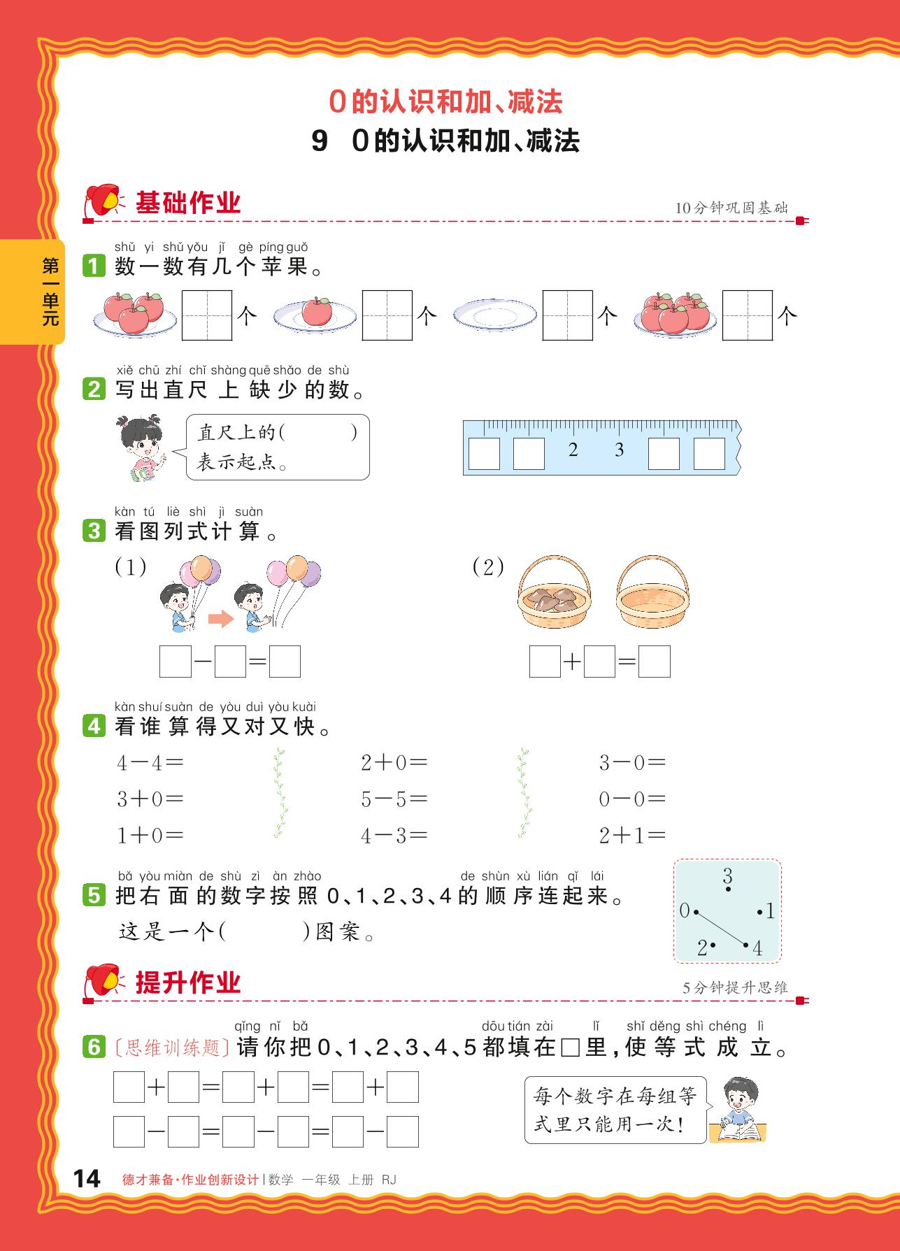 2024秋上册一年级数学人教版 第一单元 5以内数的认识和加、减法——9. 0的认识和加、减法