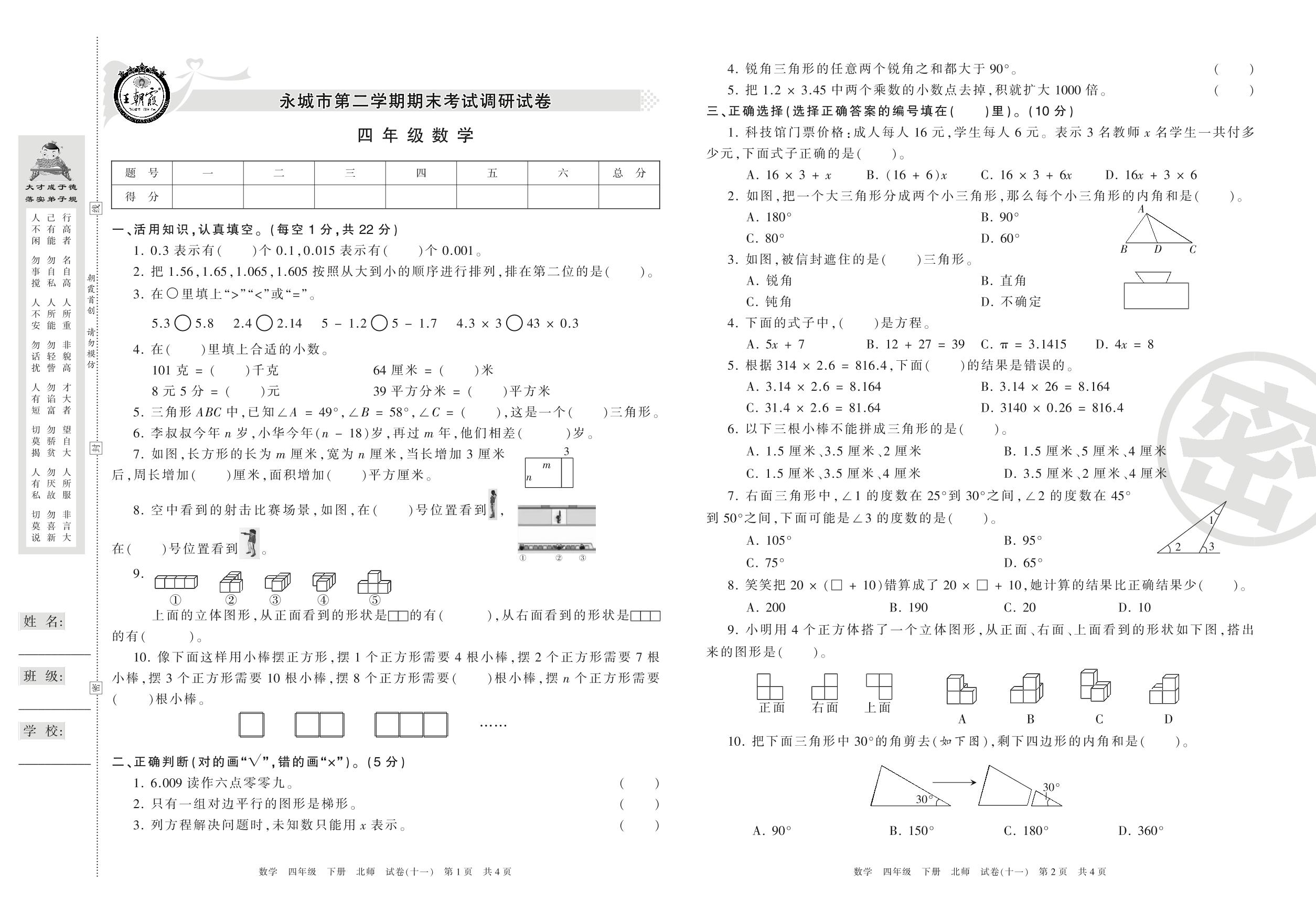 2015-2016学年第二学期永城市四年级数学试卷(北师版)【11】