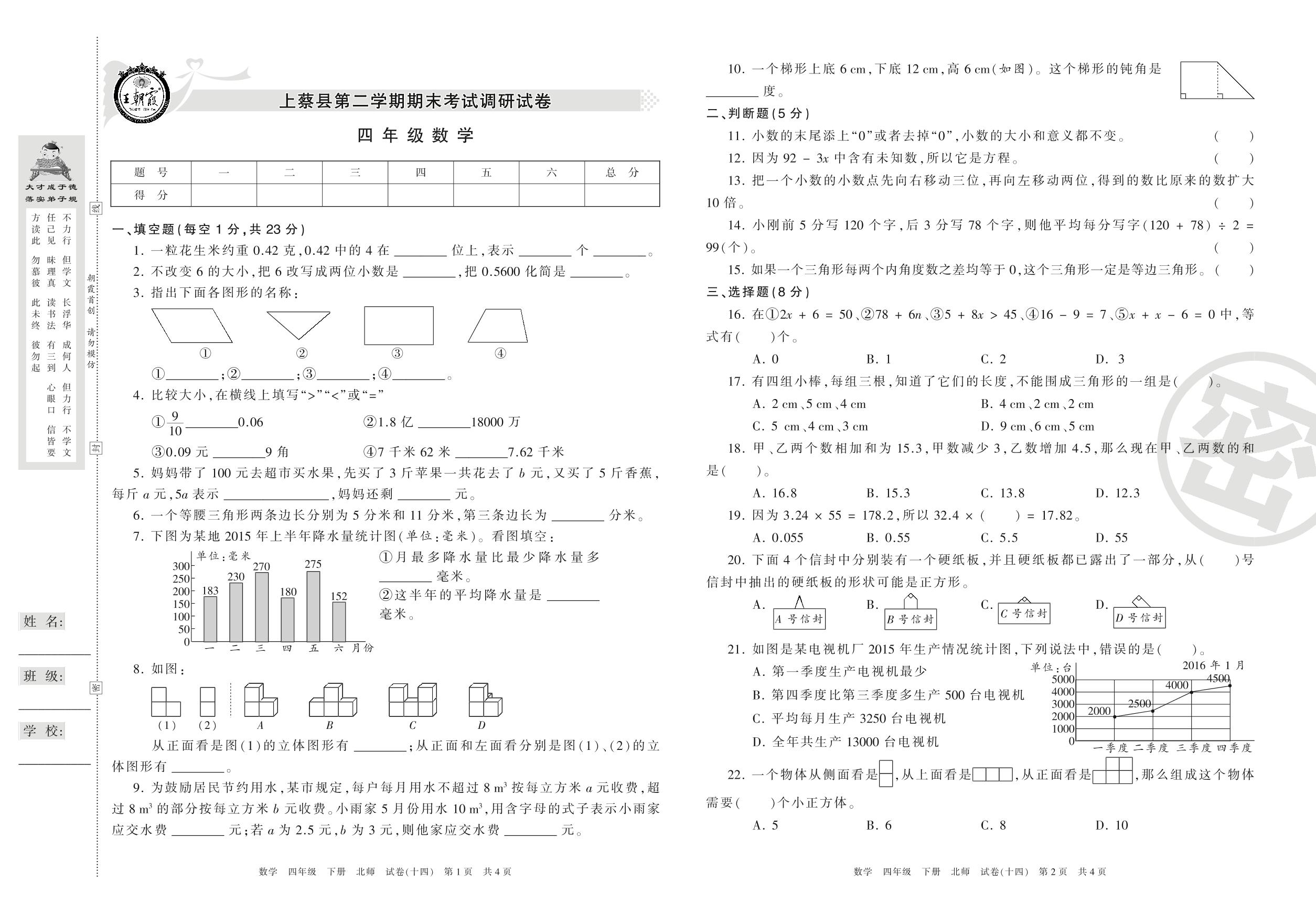 2015-2016学年第二学期驻马店市上蔡县四年级数学试卷(北师版)【14】