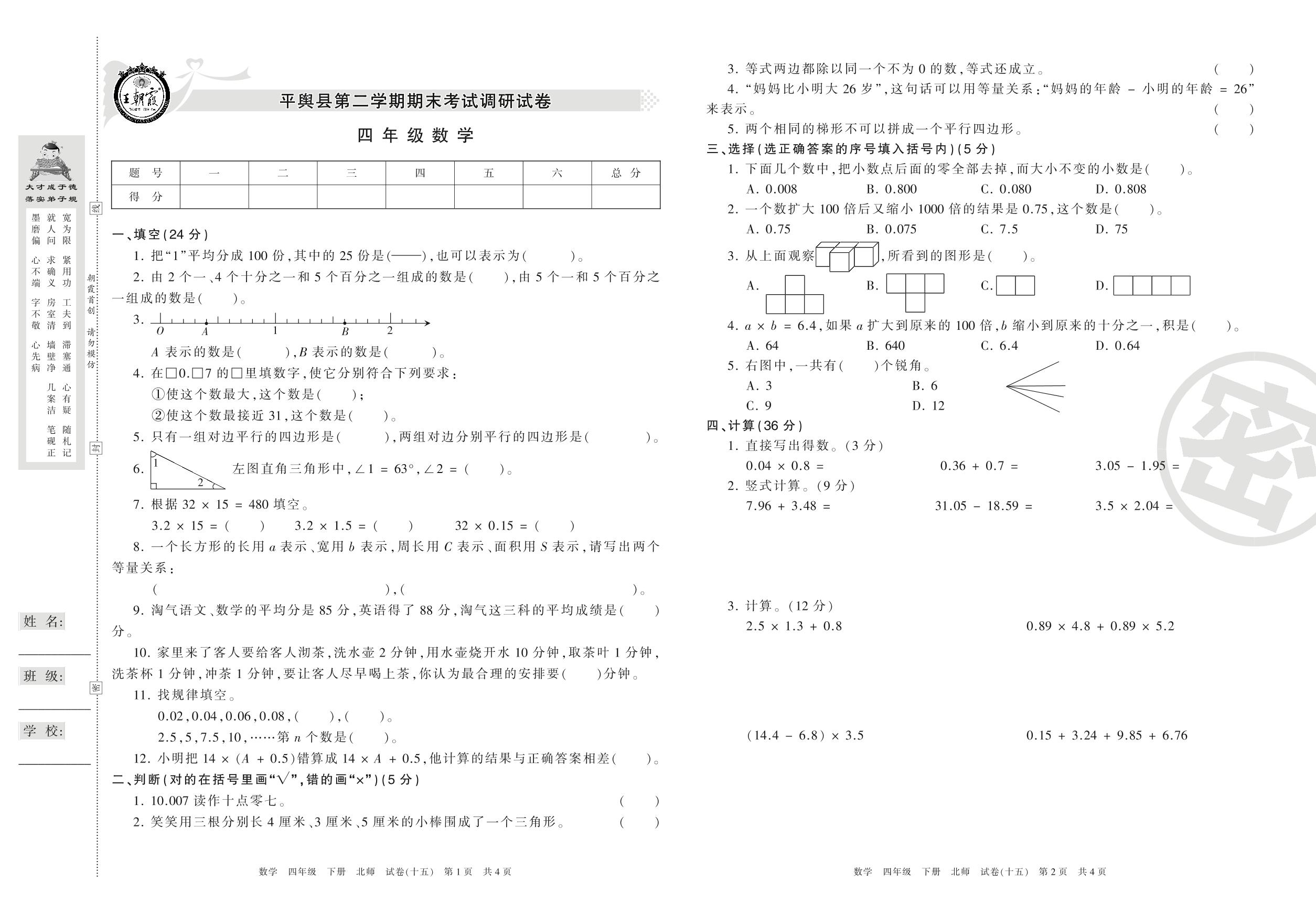 2015-2016学年第二学期驻马店市平舆县四年级数学试卷(北师版)【15】