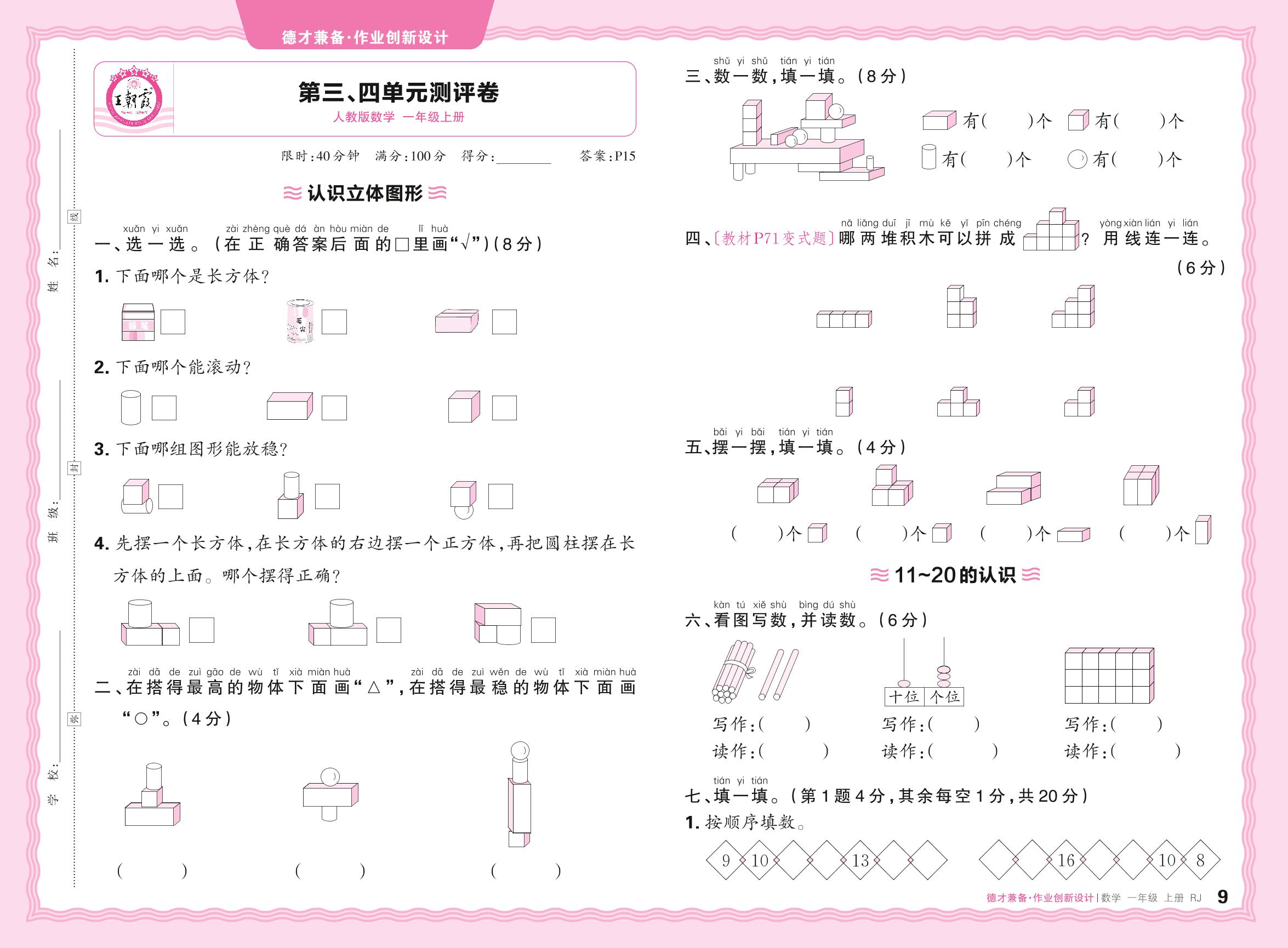 2024秋上册一年级数学人教版 第三、四单元测评卷