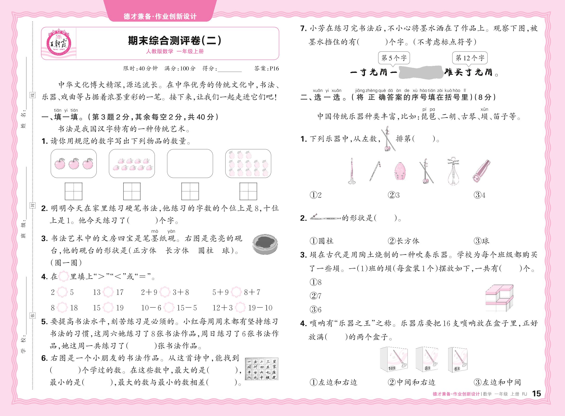2024秋上册一年级数学人教版 期末综合测评卷(二)