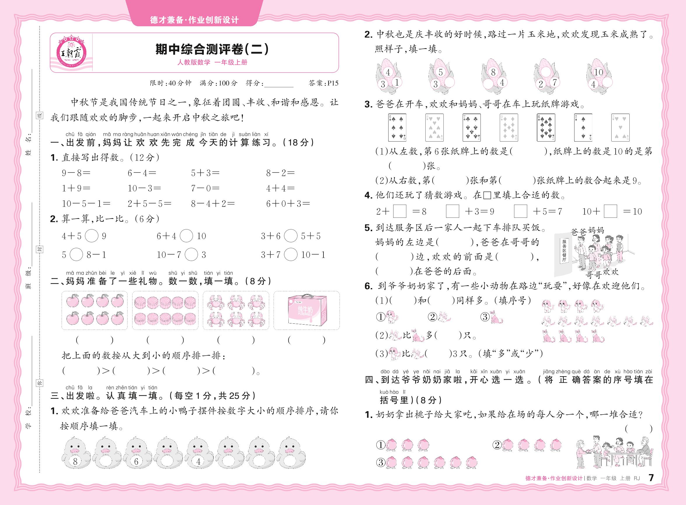 2024秋上册一年级数学人教版 期中综合测评卷(二)